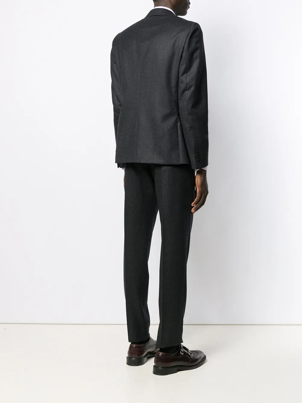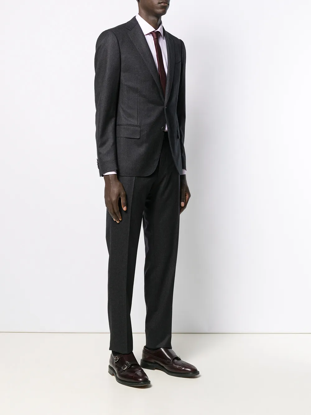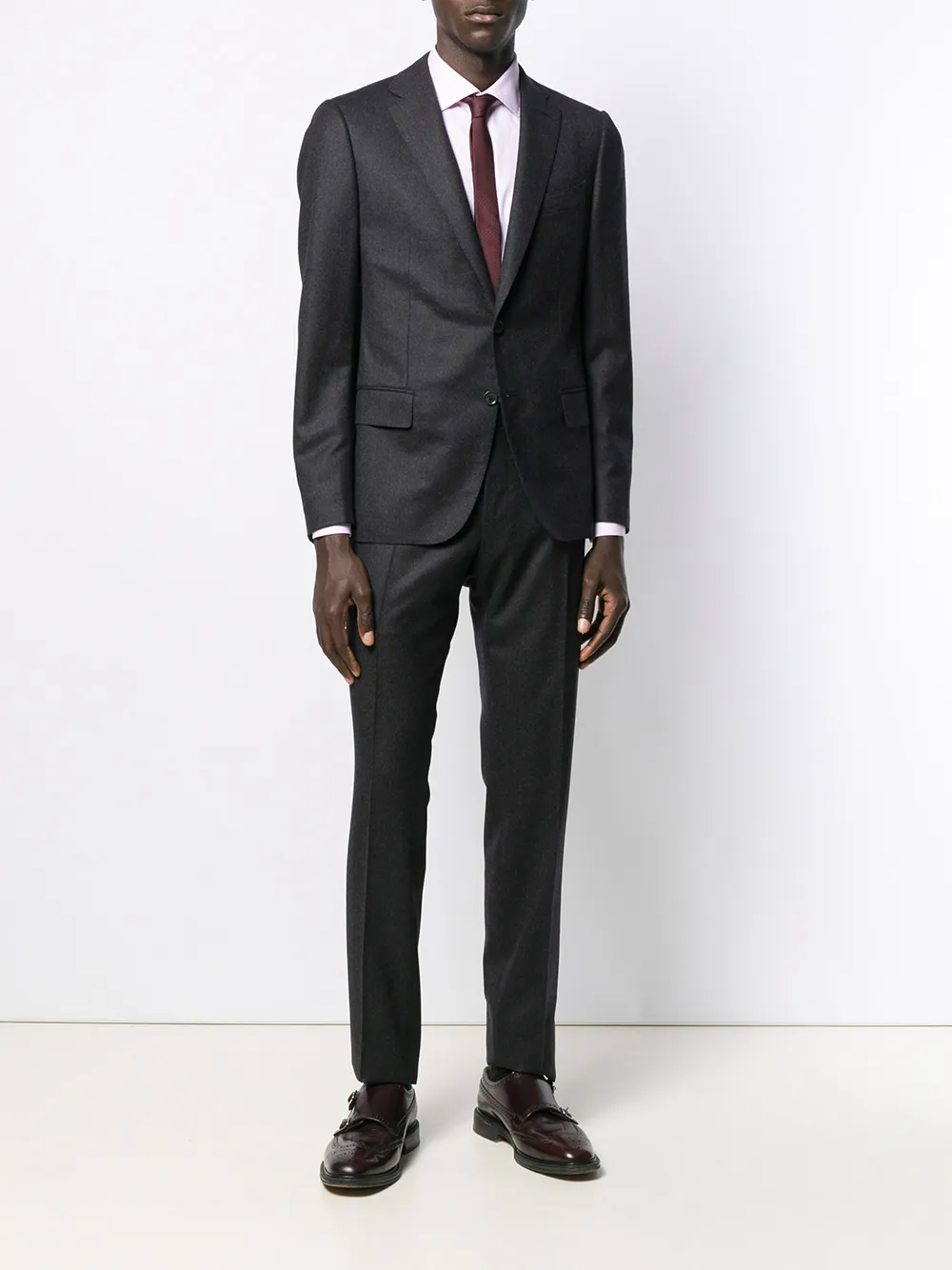 Классический костюм-двойка от Caruso. Зазубренные лацканы, застежка на пуговицах спереди, передние карманы с клапанами, шлица сзади, петли для ремня, ширинка на молнии с пуговицей, боковые карманы и задние карманы с листочкой на пуговицах.
