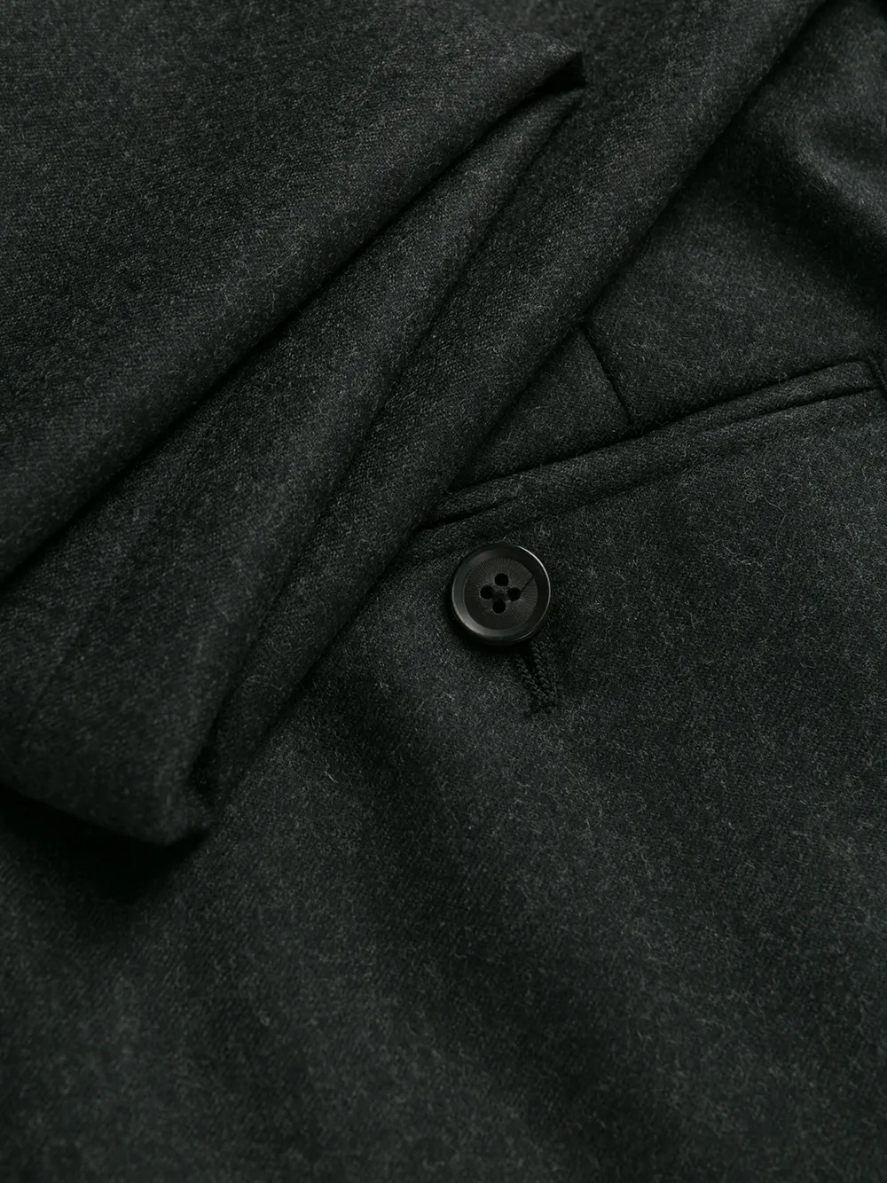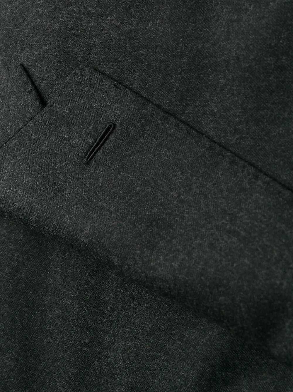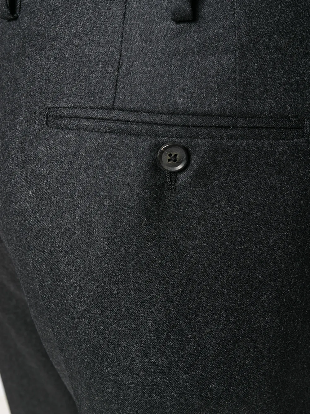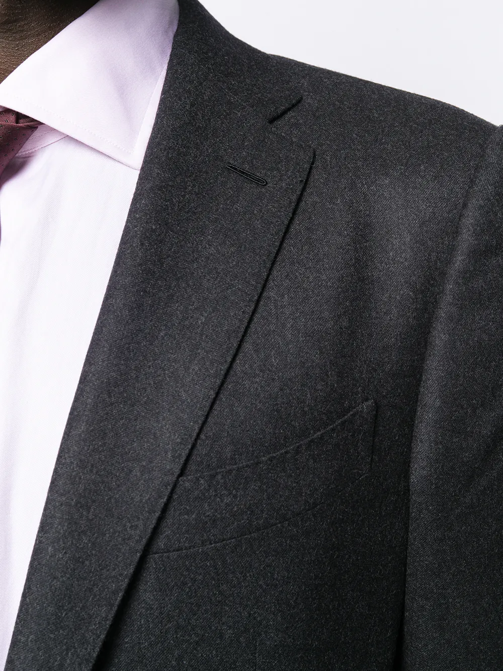Классический костюм-двойка от Caruso. Зазубренные лацканы, застежка на пуговицах спереди, передние карманы с клапанами, шлица сзади, петли для ремня, ширинка на молнии с пуговицей, боковые карманы и задние карманы с листочкой на пуговицах.