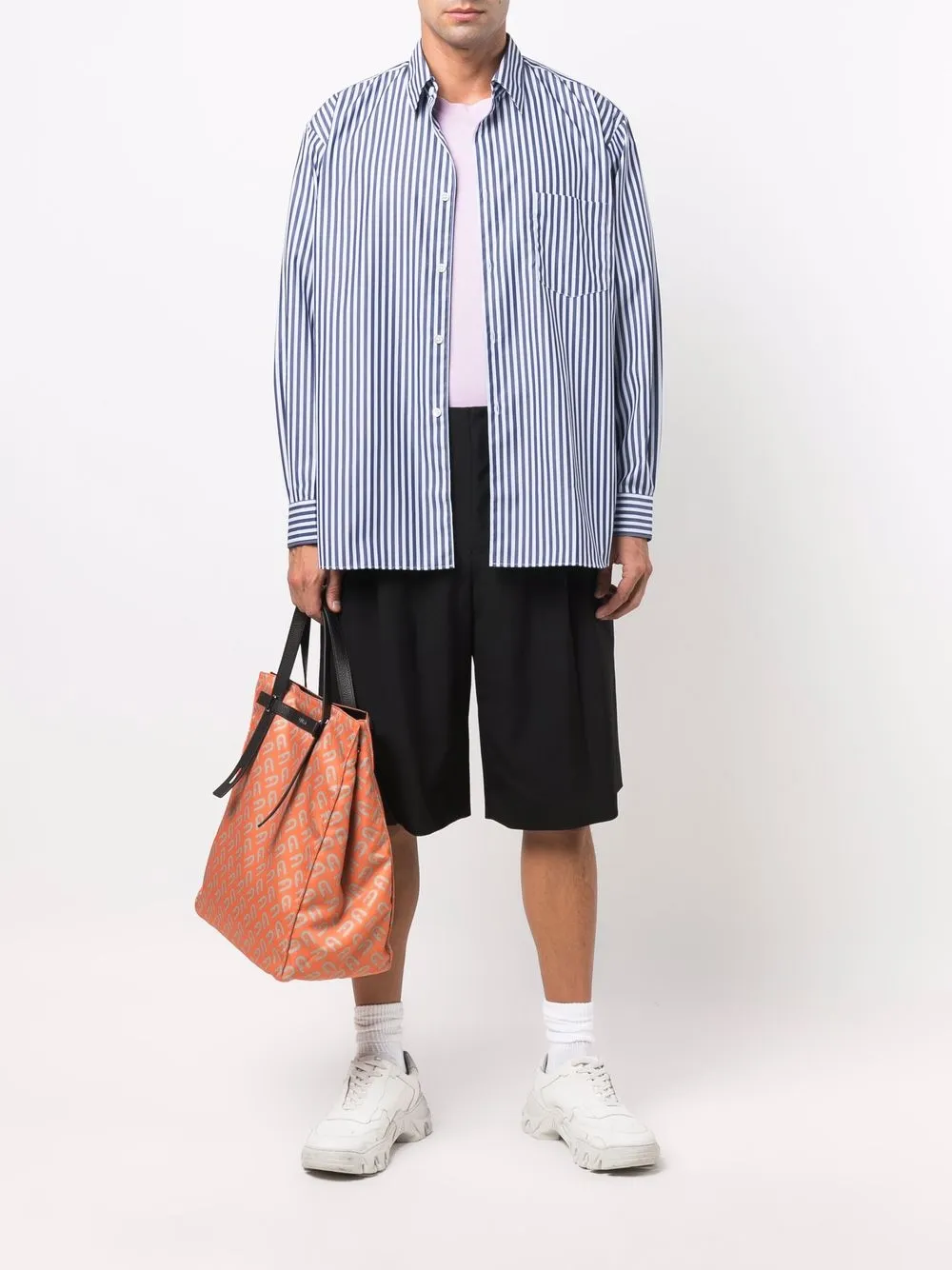 Синий/белый, хлопок, узор в вертикальную полоску, прямой воротник, застежка на пуговицах спереди, длинные рукава, манжеты на пуговицах, нагрудный накладной карман и закругленный подол.