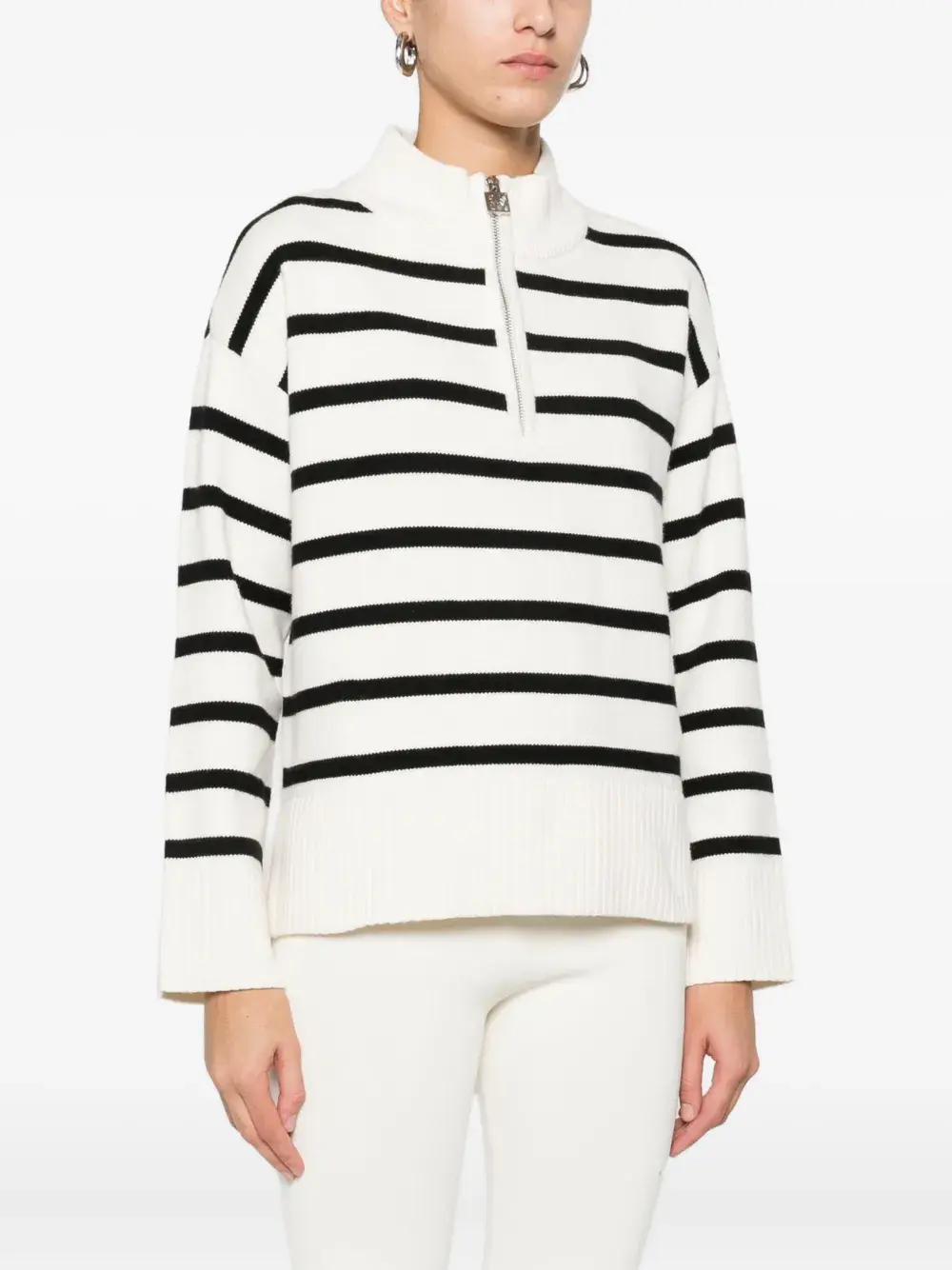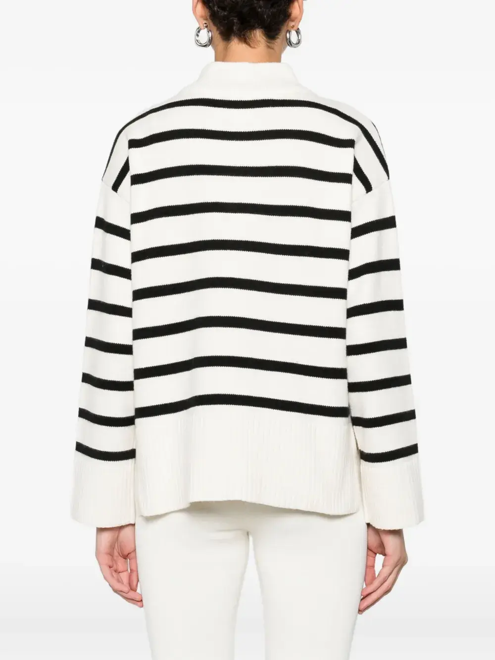 Белый свитер в горизонтальную полоску с половинной молнией, высоким воротником и ребристой вязкой