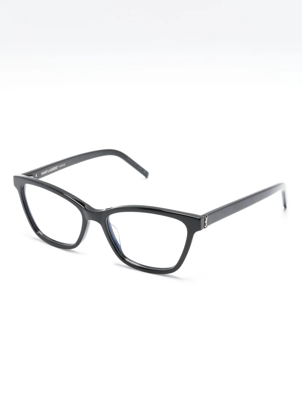 Черный, ацетат, круглая оправа, прозрачные линзы, металлический логотип на дужке, знаковый металлический логотип YSL, прямые дужки и дужки с закругленными концами. Обратите внимание, что на FARFETCH продаются оправы с линзами без диоптрий. В комплект входит защитный чехол для очков.