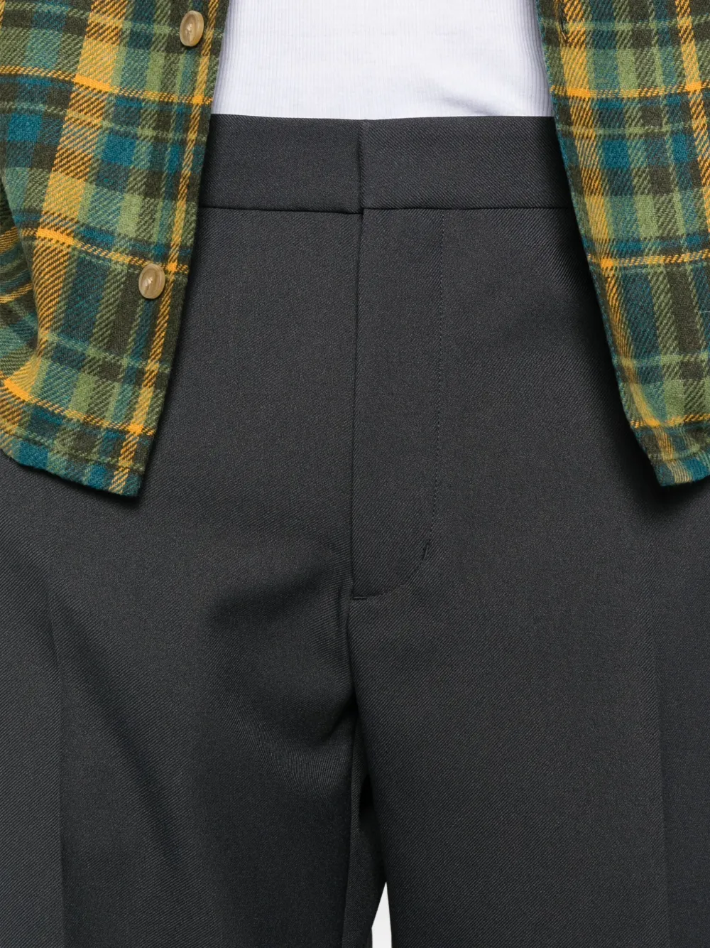 Серые шлевки для ремня, боковые карманы в швах, задние прорезные карманы, скрытая застежка спереди, стрелки