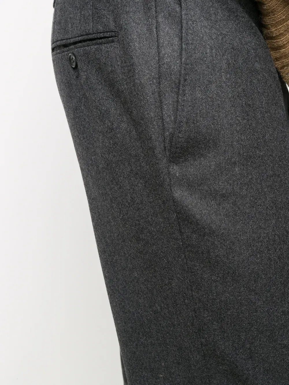Завышенная талия, петли для ремня, застежка на молнии и пуговице спереди, два кармана с листочкой сзади, два прорезных кармана по бокам и прямой крой.