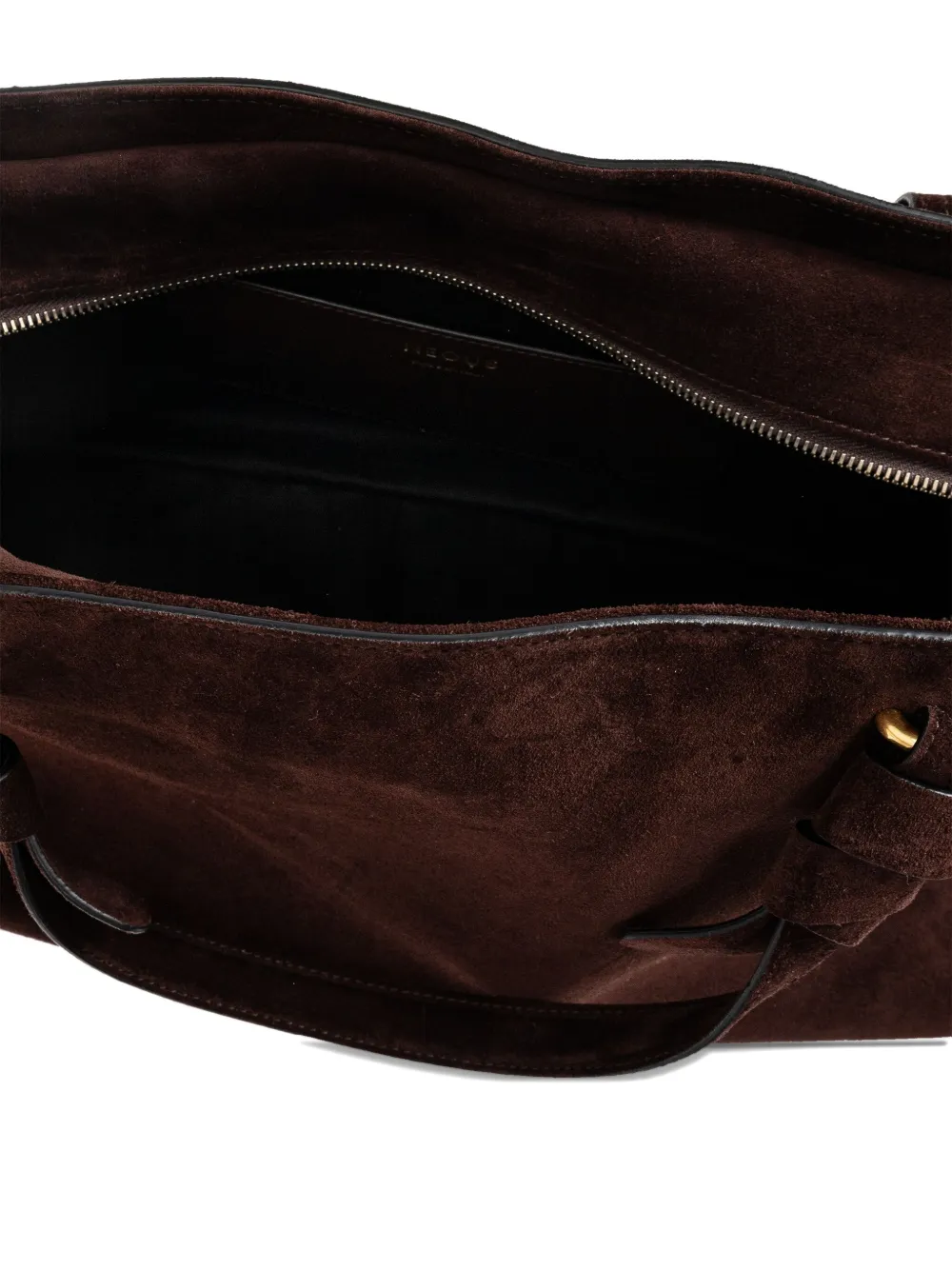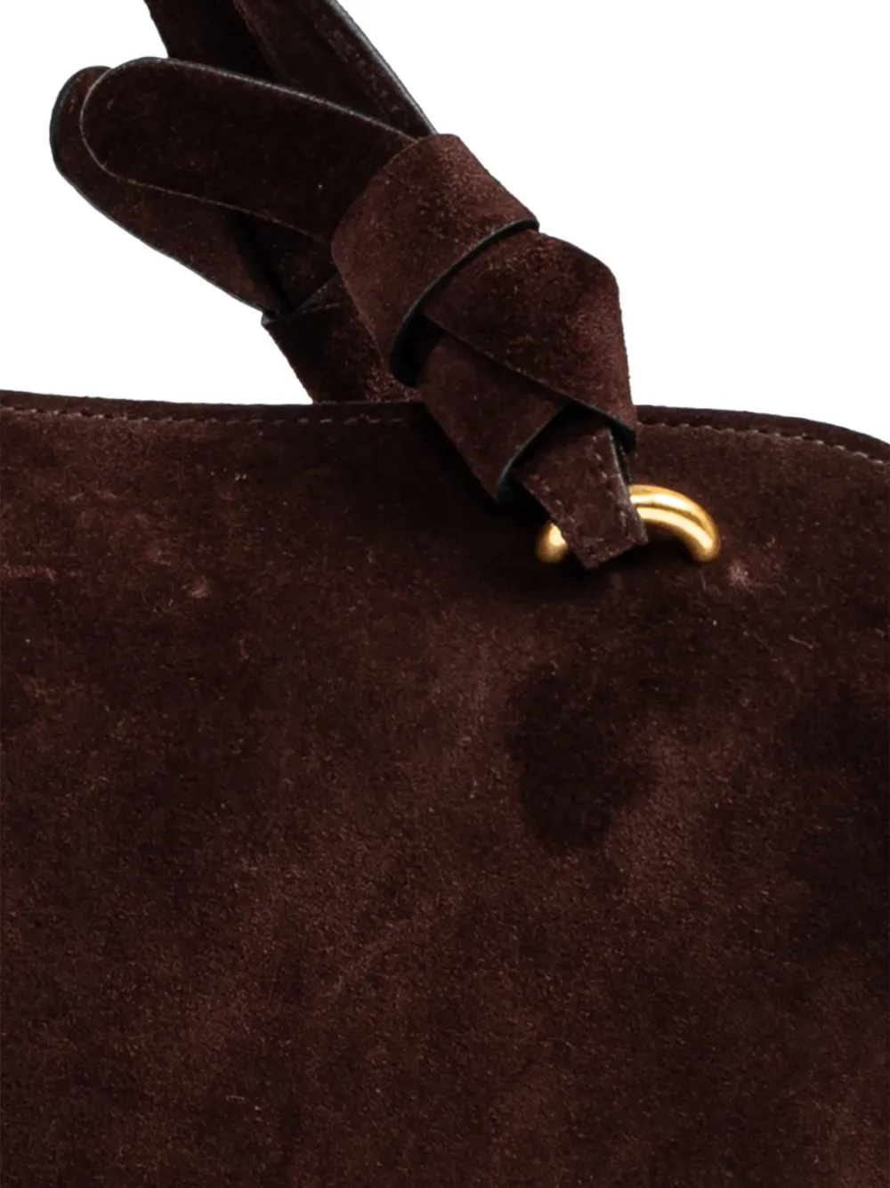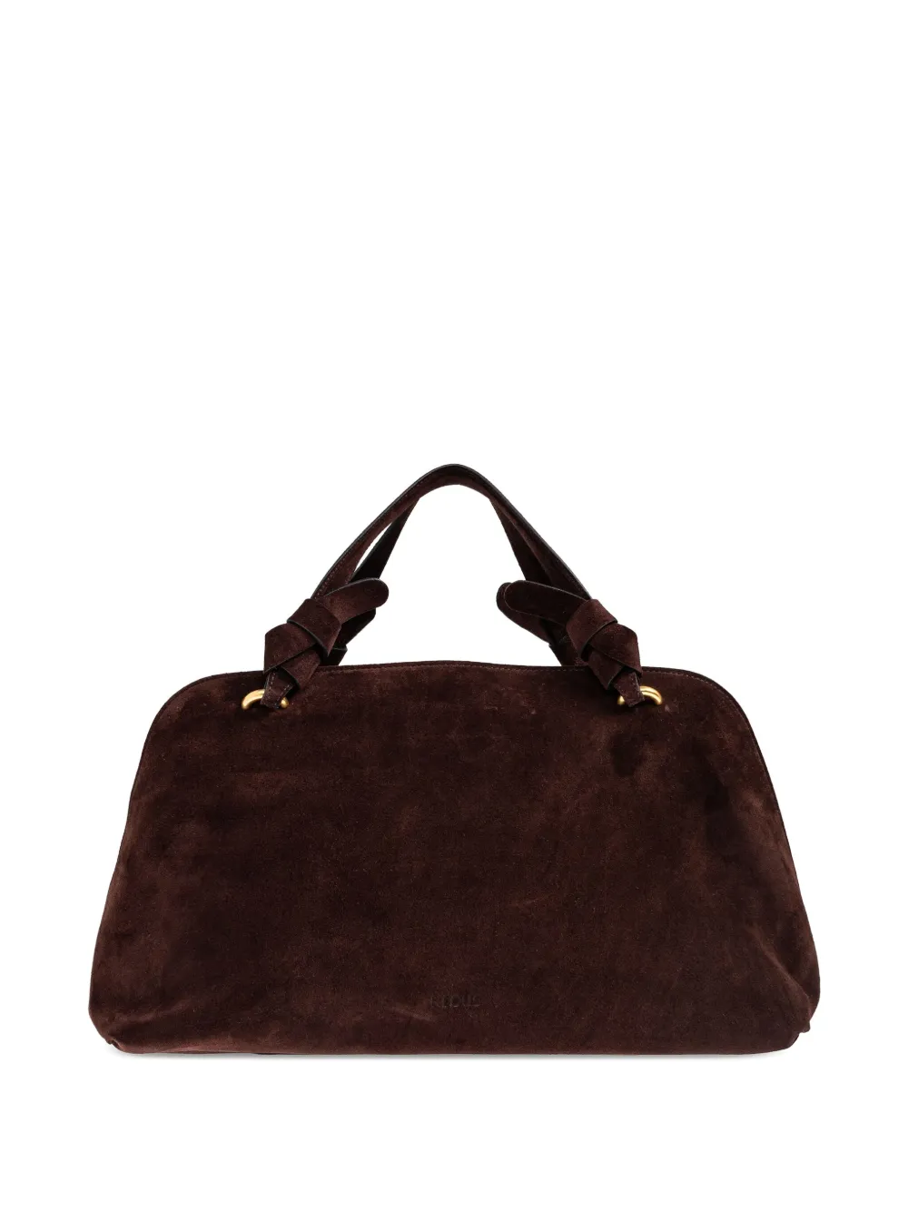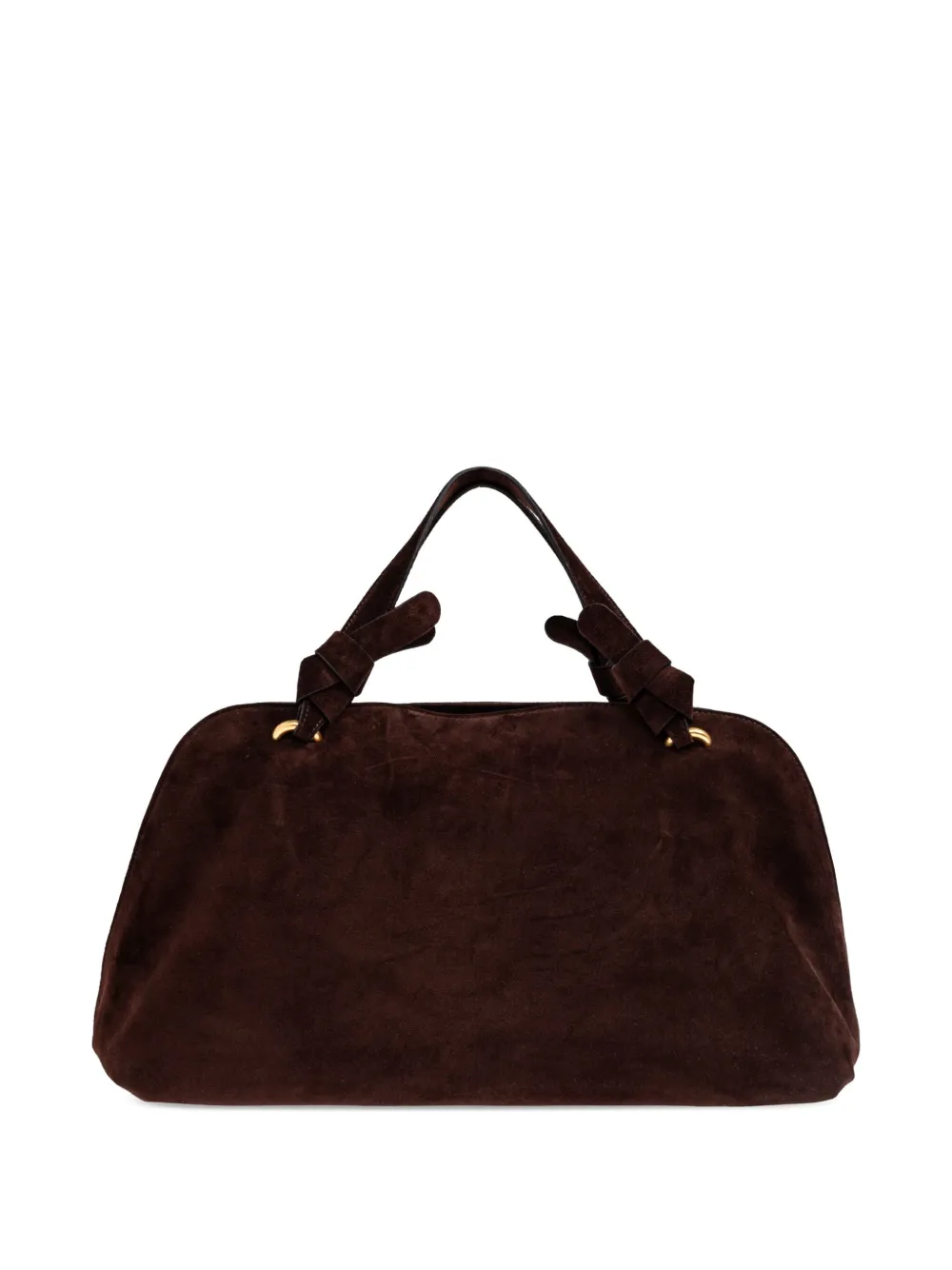 Темно-шоколадная замша, верхняя ручка, узелковая отделка, фурнитура золотистого цвета, застежка-молния