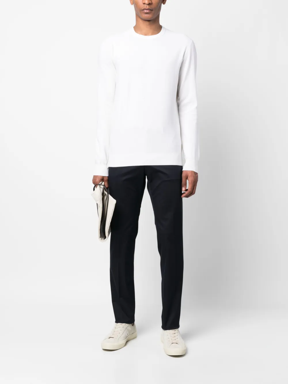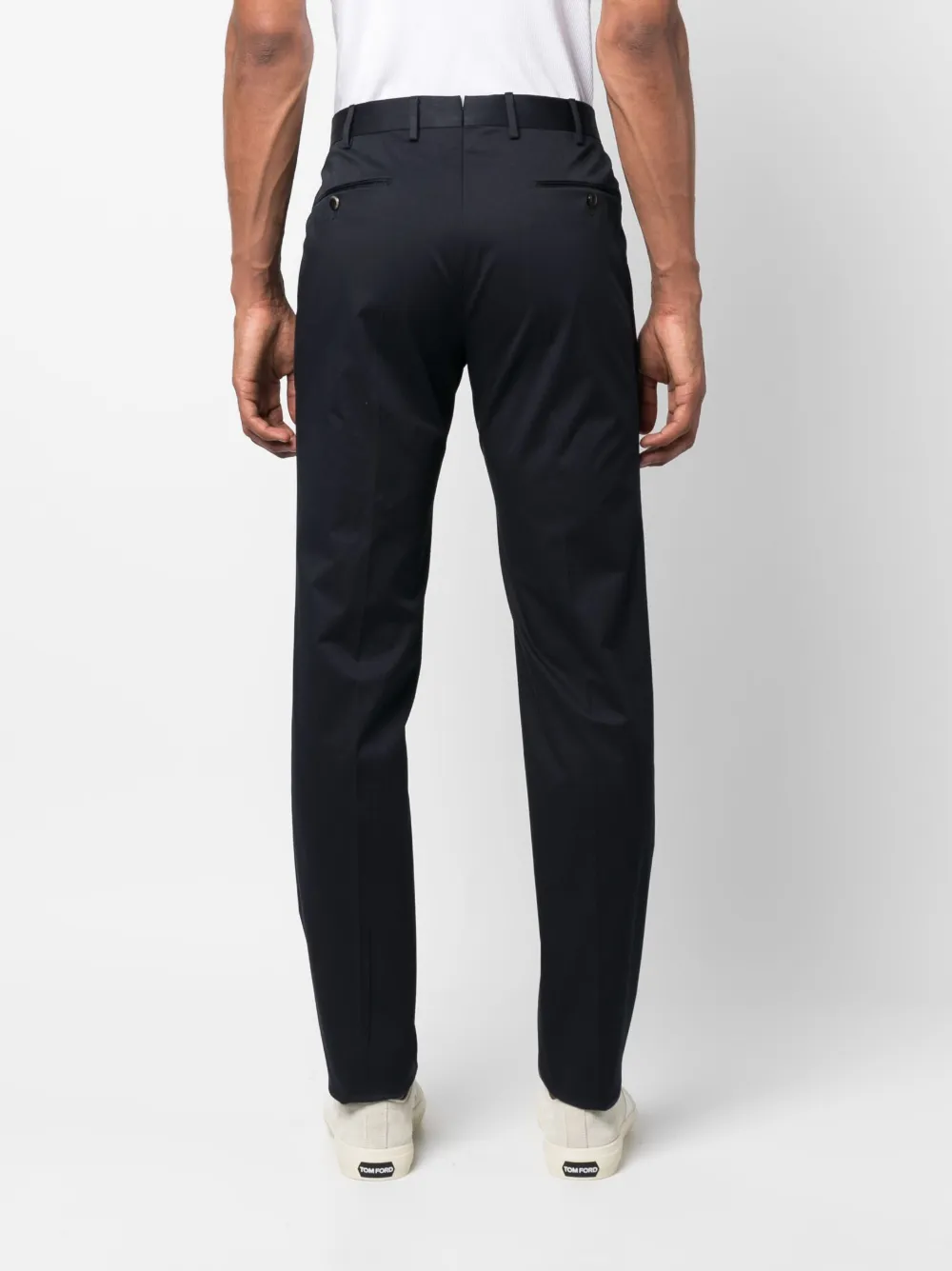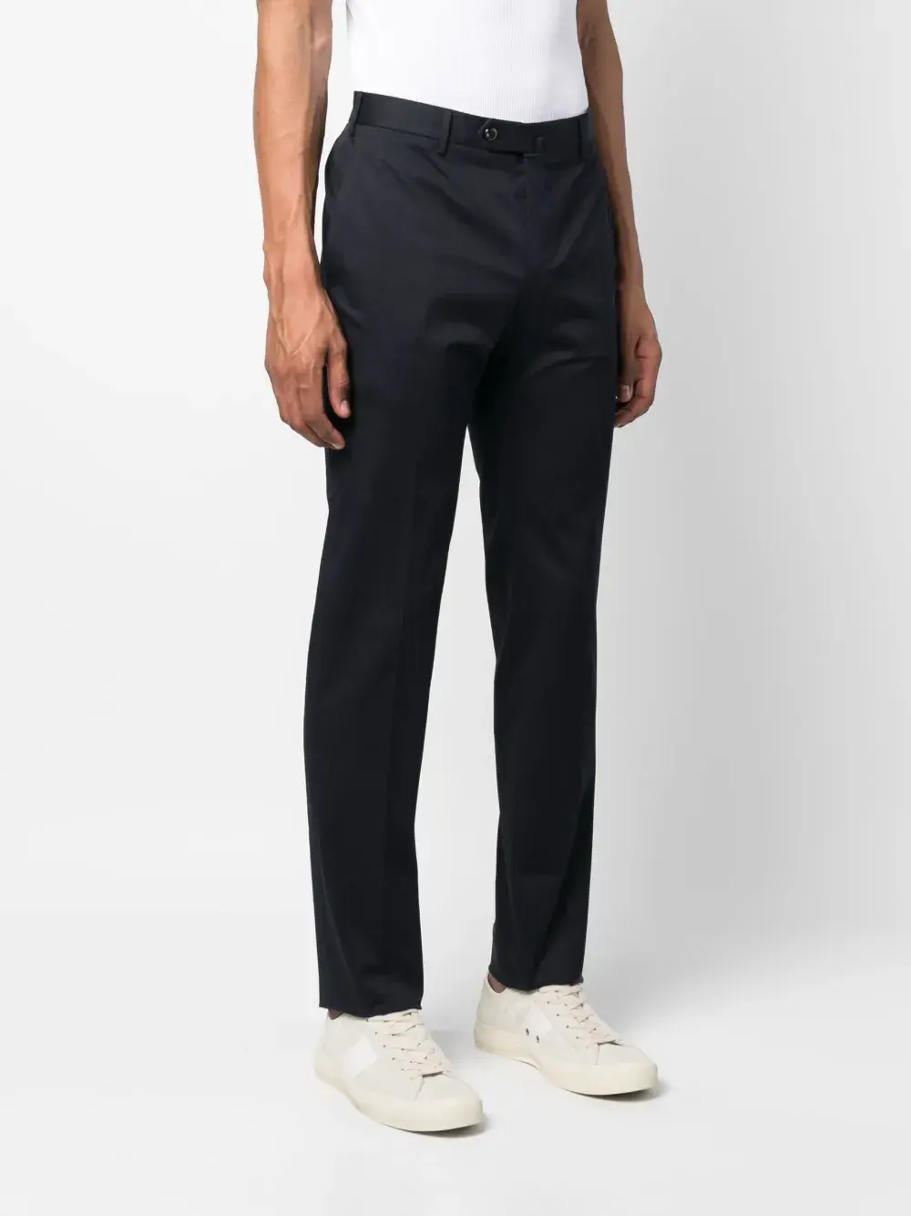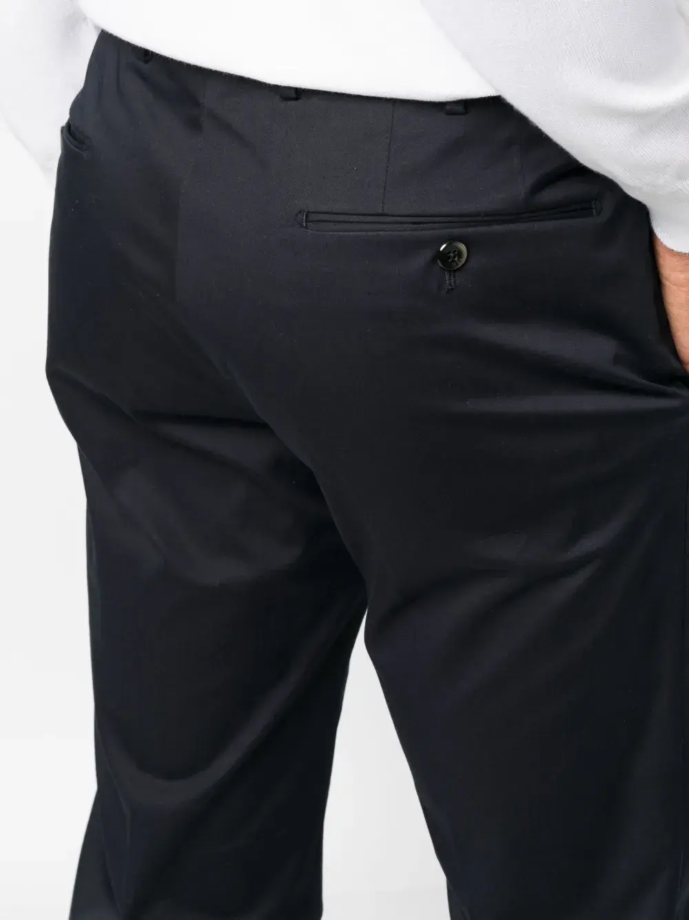 Темно-синий, эластичный хлопок, смещенная застежка на пуговицах спереди, два вшитых кармана по бокам, два прорезных кармана сзади, петли для ремня, зауженный крой и прямой подол.