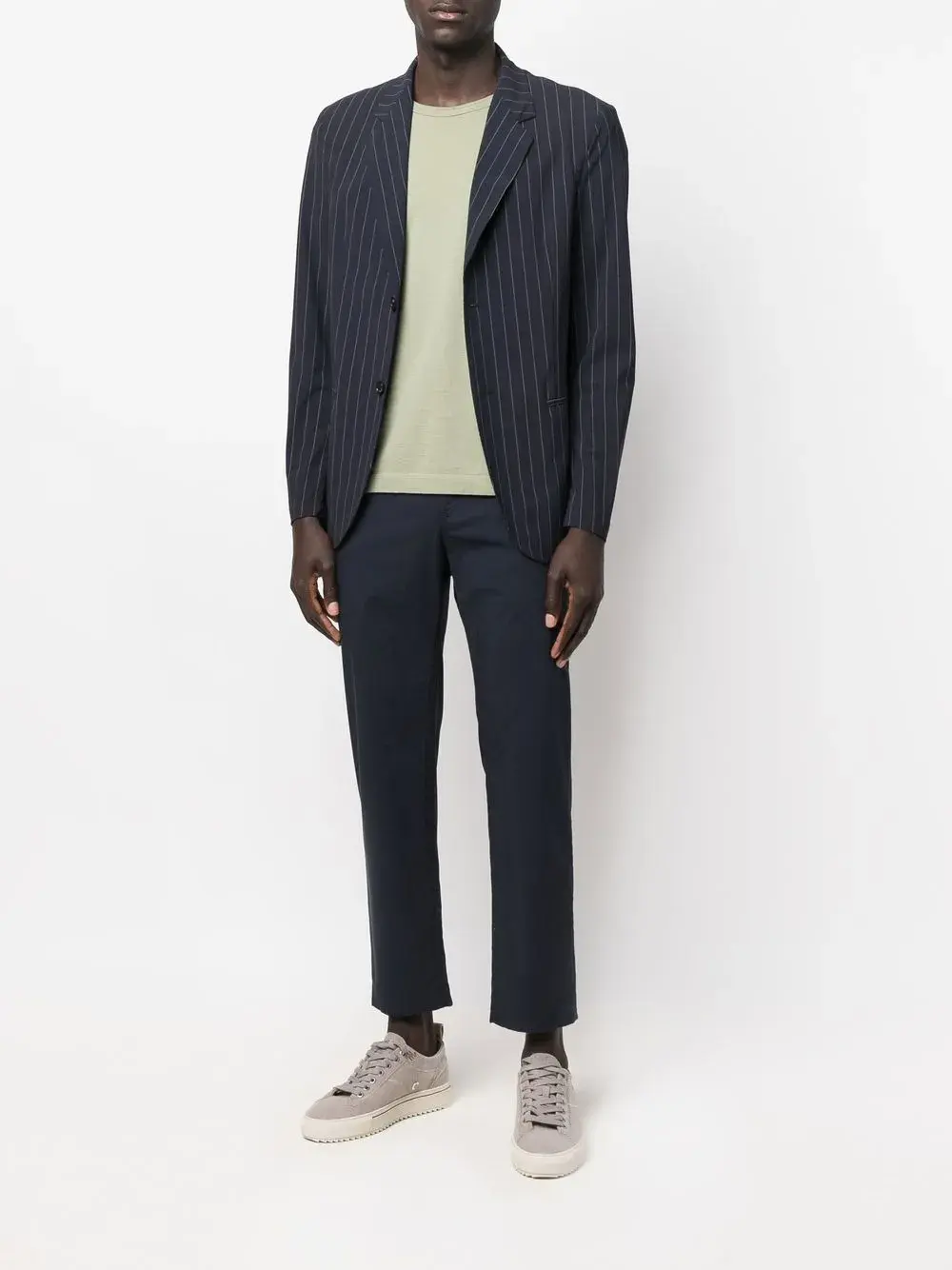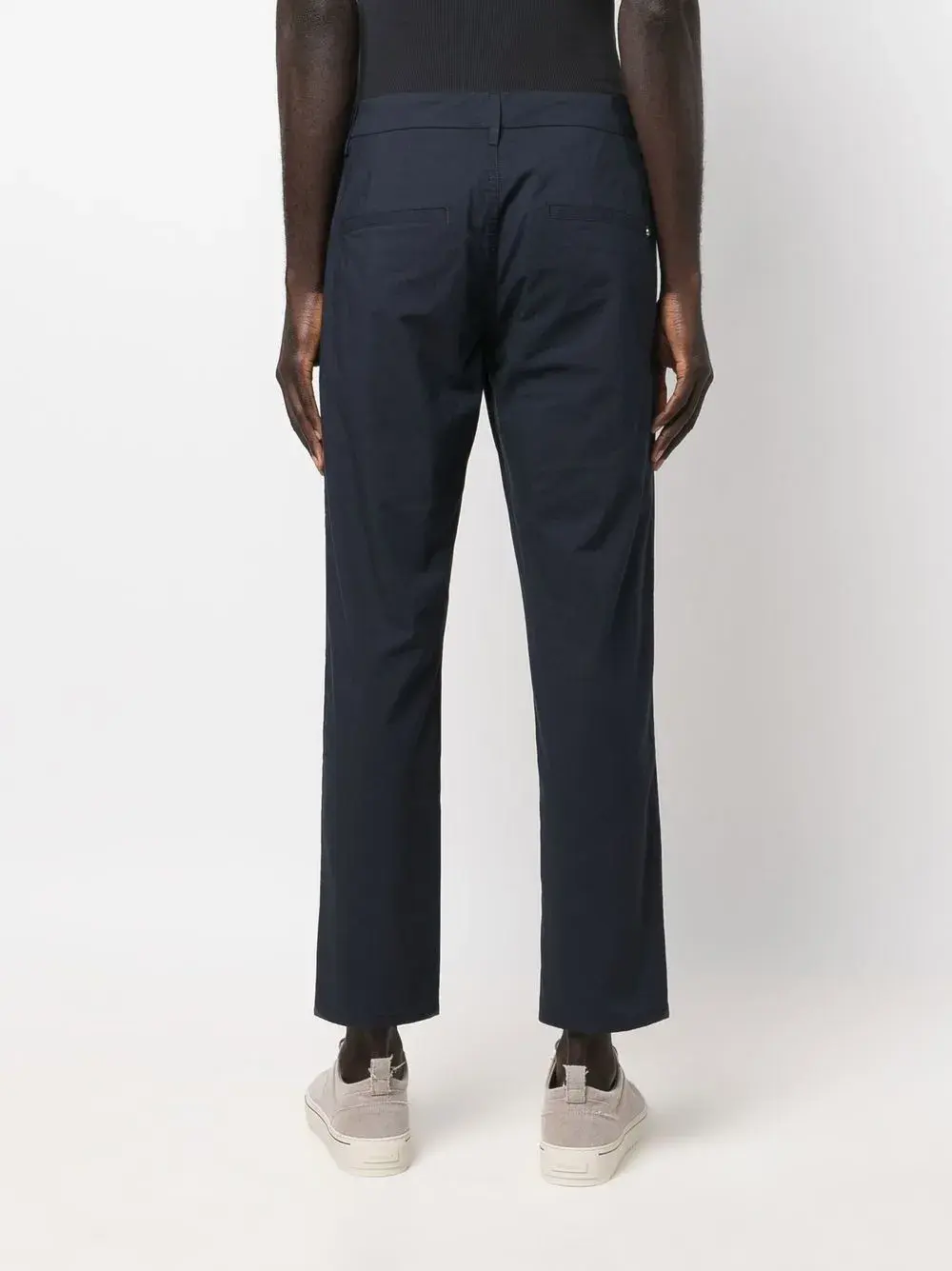 Синий, хлопок, прямой крой, укороченная длина, потайная застежка спереди, строгий крой и прорезные карманы по бокам.