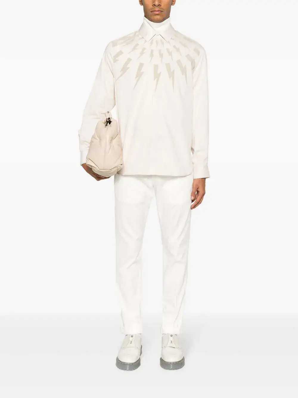 Белый, эластичный хлопок, петли для ремня, потайная застежка на кнопках спереди, зауженный крой, два вшитых кармана по бокам, два прорезных кармана на пуговицах сзади и подвороты.