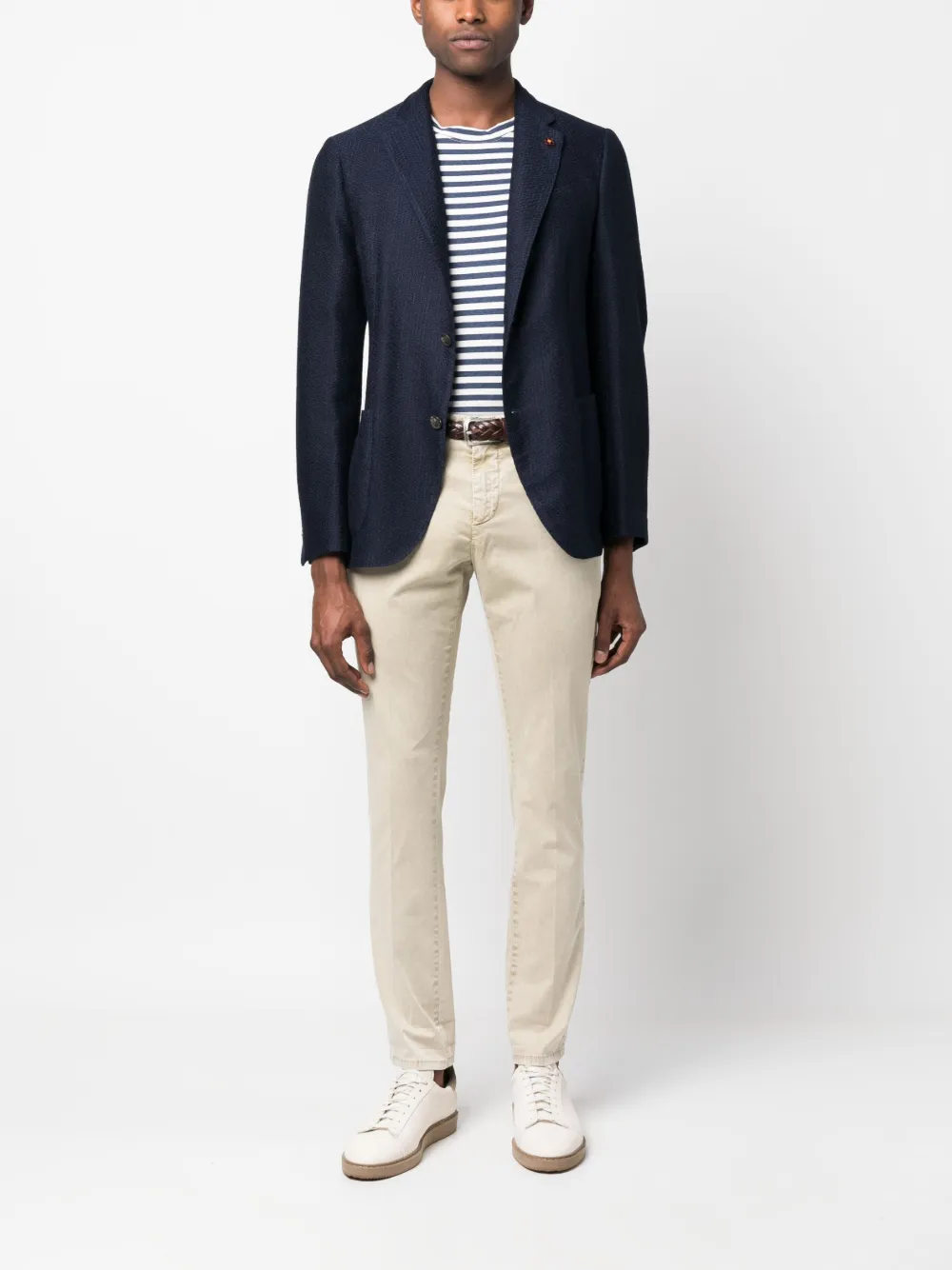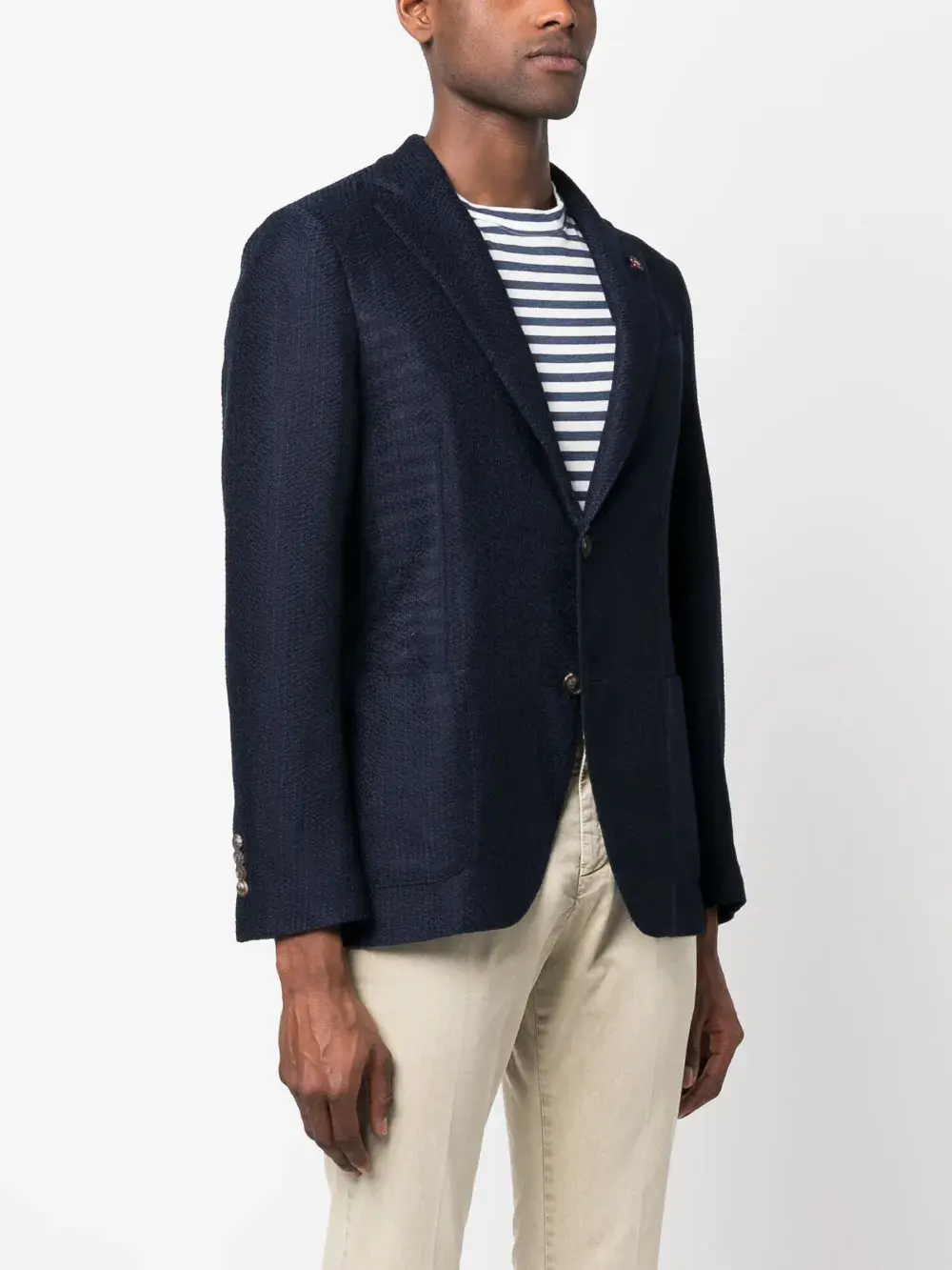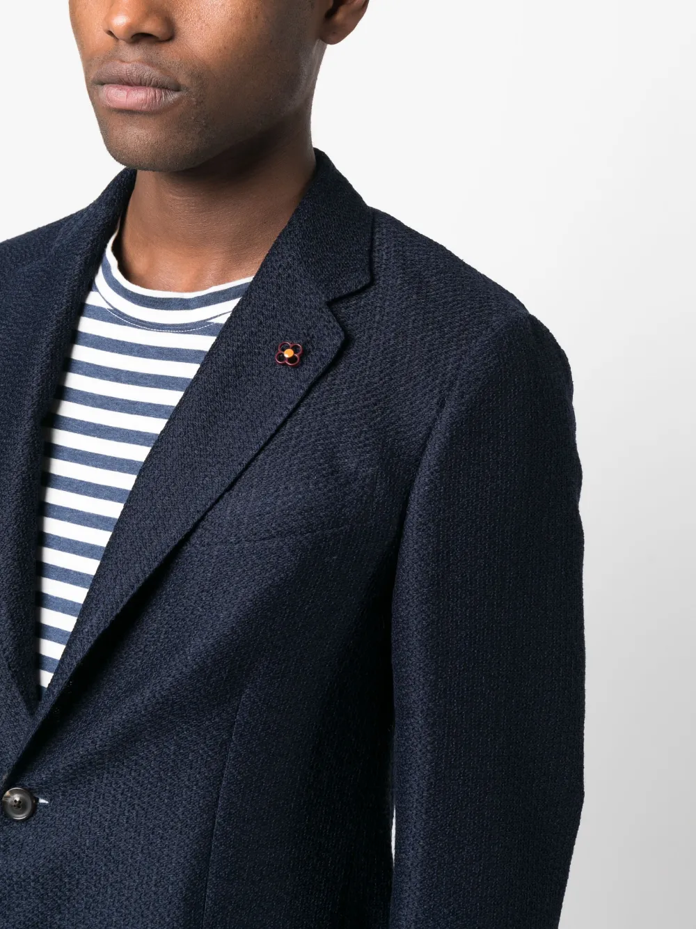 Темно-синий, смесовый хлопок, металлический логотип, фактурная отделка, зазубренные лацканы, застежка на пуговицах спереди, длинные рукава, манжеты на пуговицах, прорезной карман на груди, два накладных кармана спереди и закругленный подол.