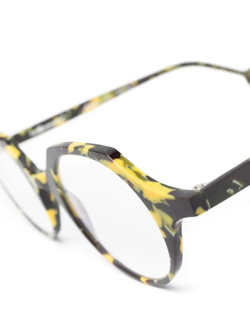 Желтый, ацетат, черепаховая расцветка, круглая оправа, прозрачные линзы, прямые дужки и дужки с закругленными концами. Обратите внимание, что на FARFETCH продаются оправы с линзами без диоптрий. В комплект входит защитный чехол для очков.