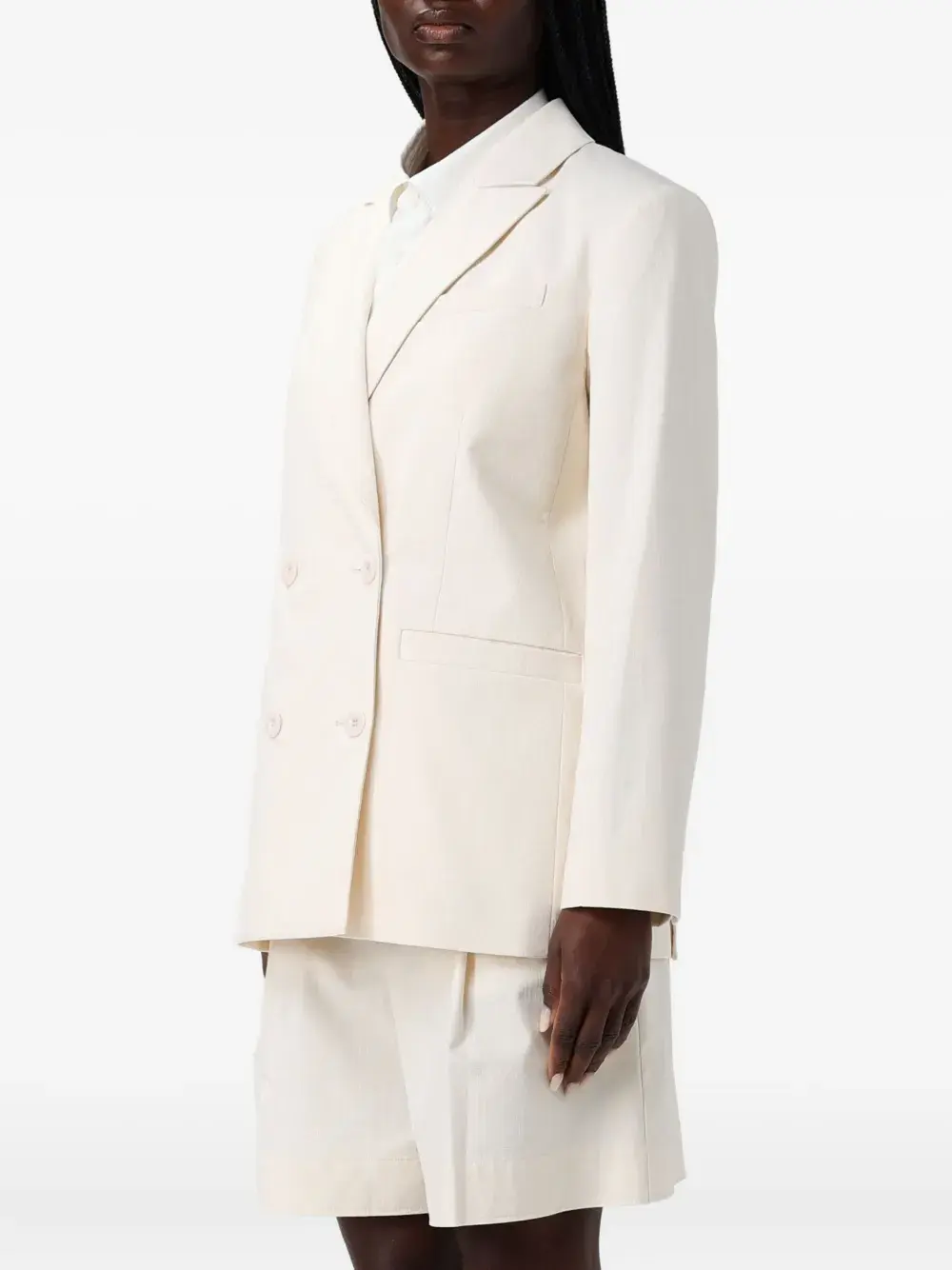 Белый двубортный пиджак с застежкой на пуговицы, лацканами с острыми отворотами и длинными рукавами