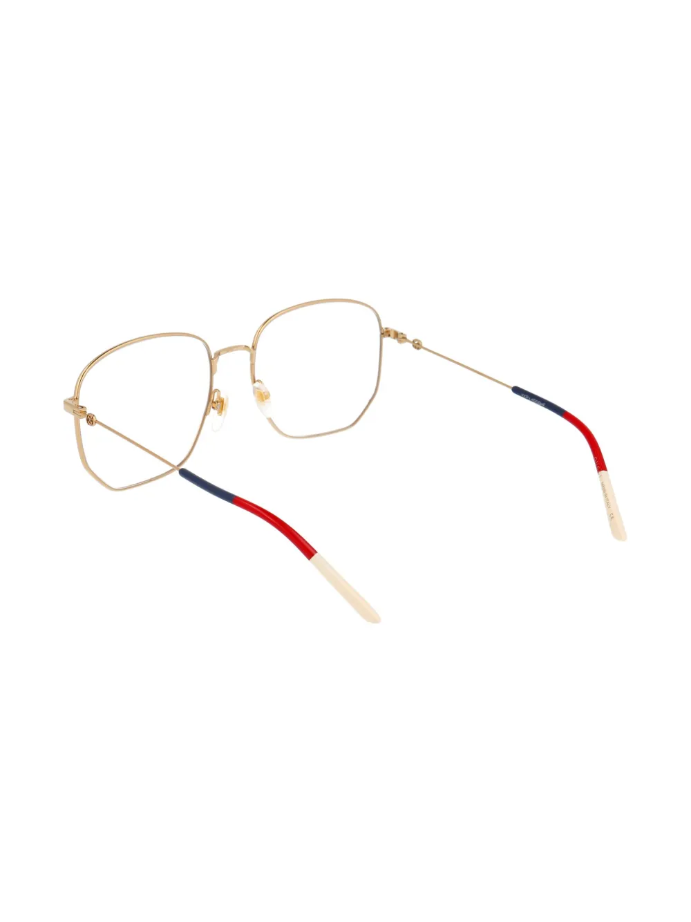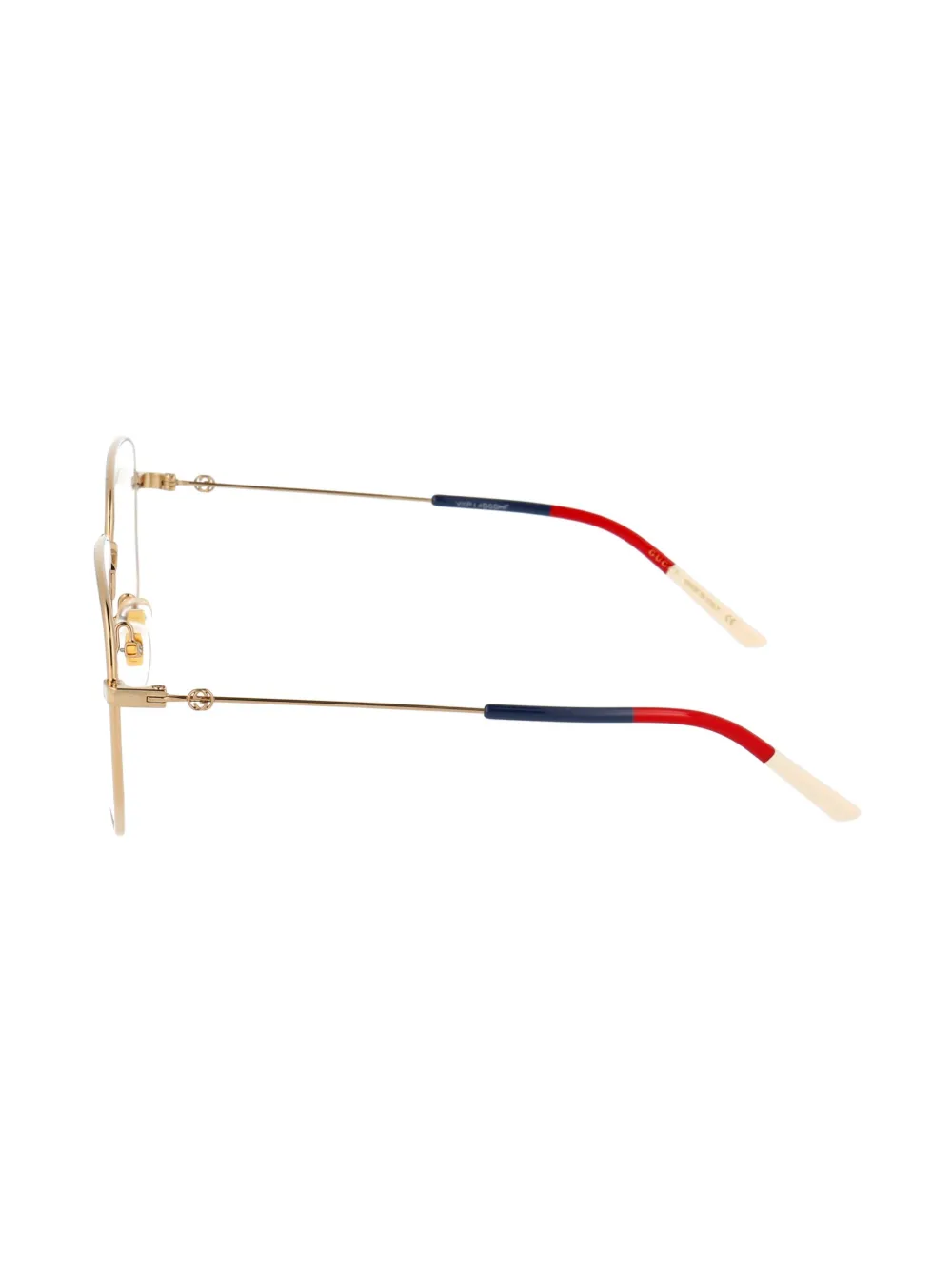 Золотистые металлические шестиугольные очки от Gucci Eyewear. Логотип GG, прямые дужки с изогнутыми концами, сине-красно-белая полоска Sylvie Web. Прилагается защитный чехол.
