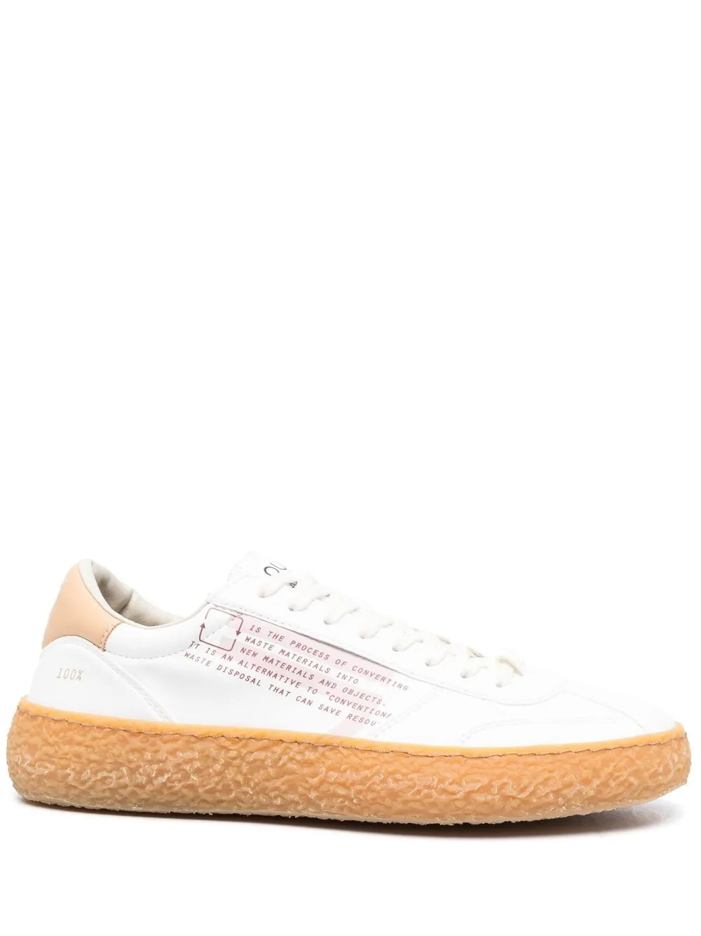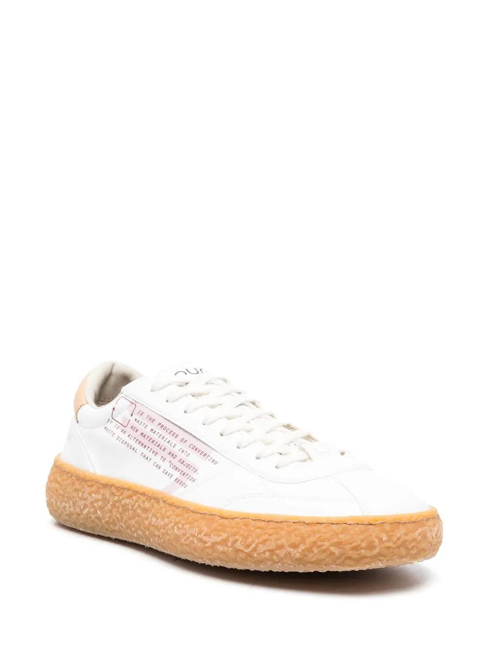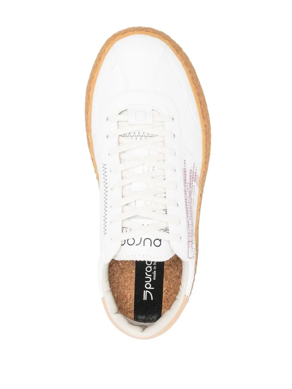 Белый, пробка, принт с надписью сбоку, язычок с логотипом, шнуровка спереди и закругленный носок.