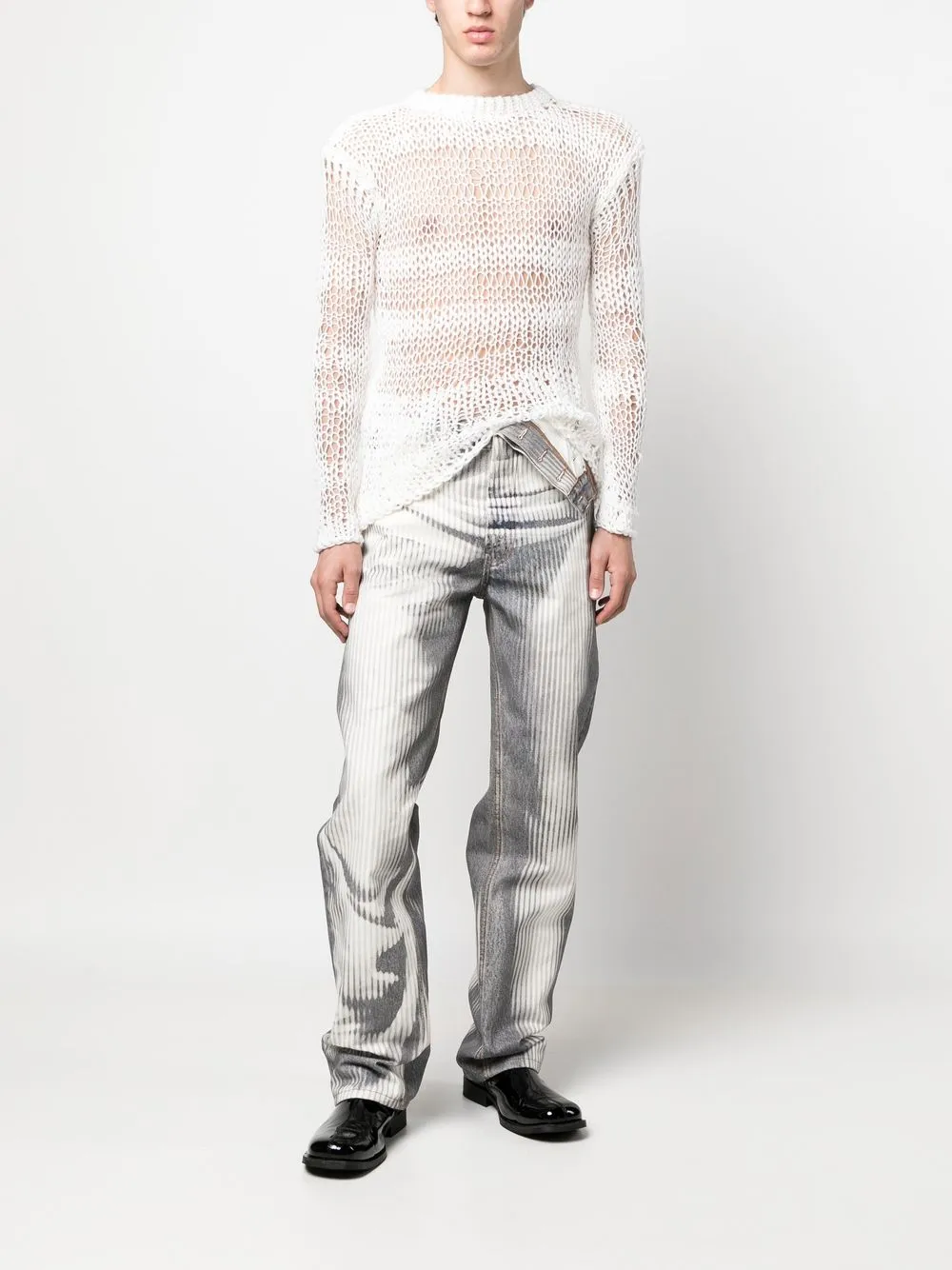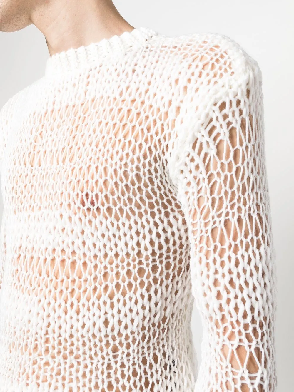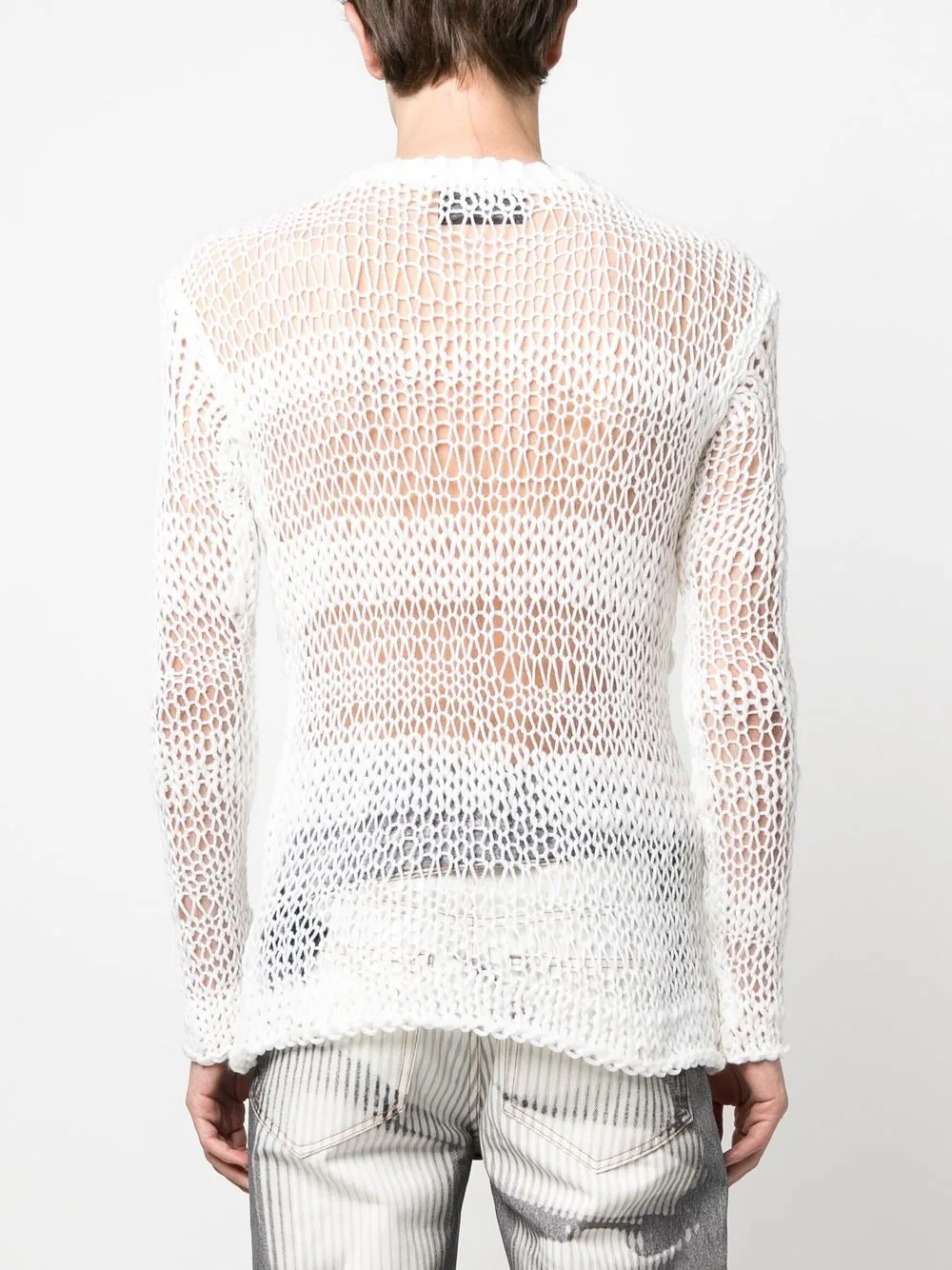 Кремовый, смесовая шерсть, ажурная вязка, полупрозрачный дизайн, круглый вырез и длинные рукава.