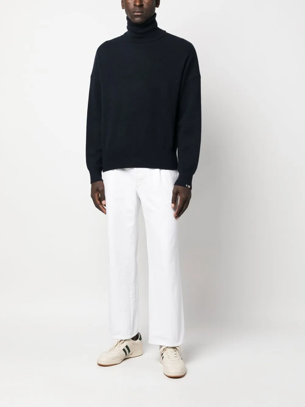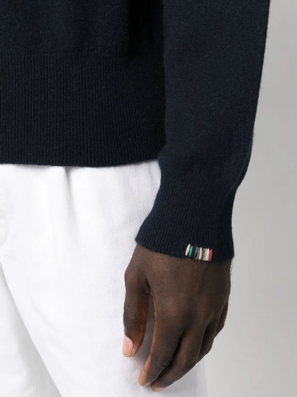 Темно-синий, смесовый кашемир, тонкая вязка, высокий воротник, длинные рукава и подол в рубчик. Ответственный выбор: Мы объединились с агентством Good On You, которое оценивает бренды по степени их влияния на животных, людей и планету в целом. Этот бренд использует этичные по отношению к животным практики, поэтому получил хорошую оценку.