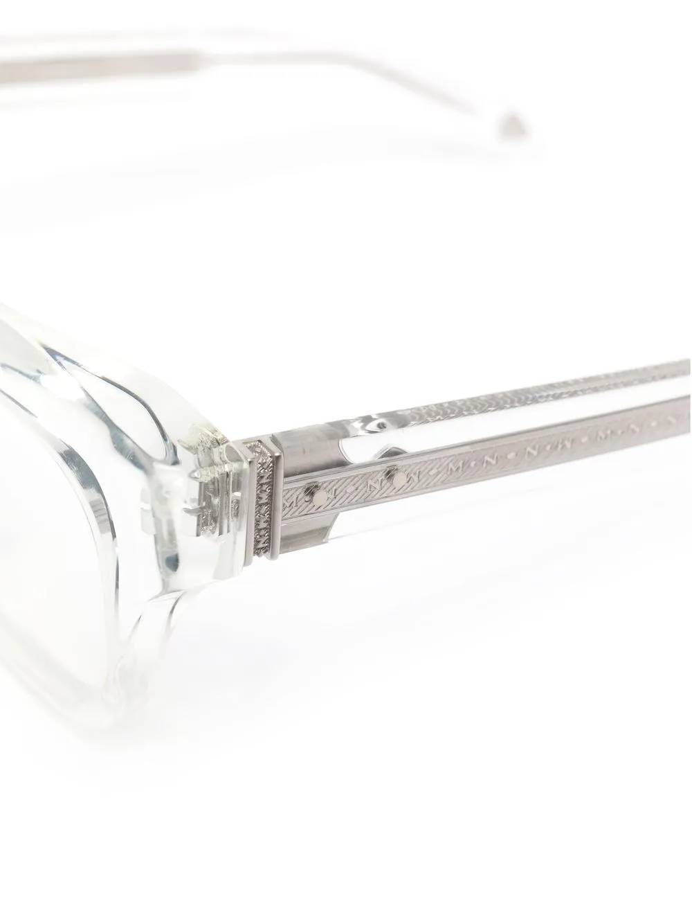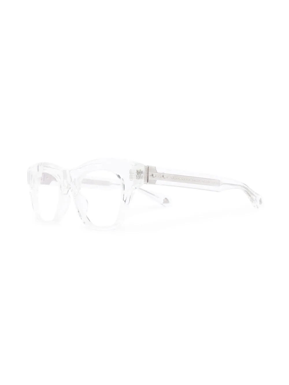 Прозрачный материал, металл, ацетат, прозрачная оправа, серебристая фурнитура, трапециевидная оправа, прозрачные линзы, носоупоры, прямые дужки и дужки с закругленными концами. В комплект входит защитный чехол для очков. Обратите внимание, что на FARFETCH продаются оправы с линзами без диоптрий.