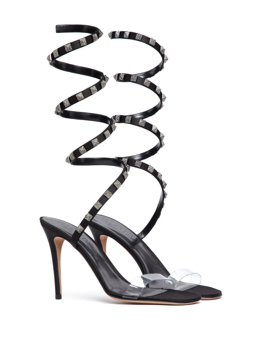 Черный, кожа, серебристые заклепки Rockstud, прозрачный ремешок, каблук на высокой шпильке и стелька с логотипом.