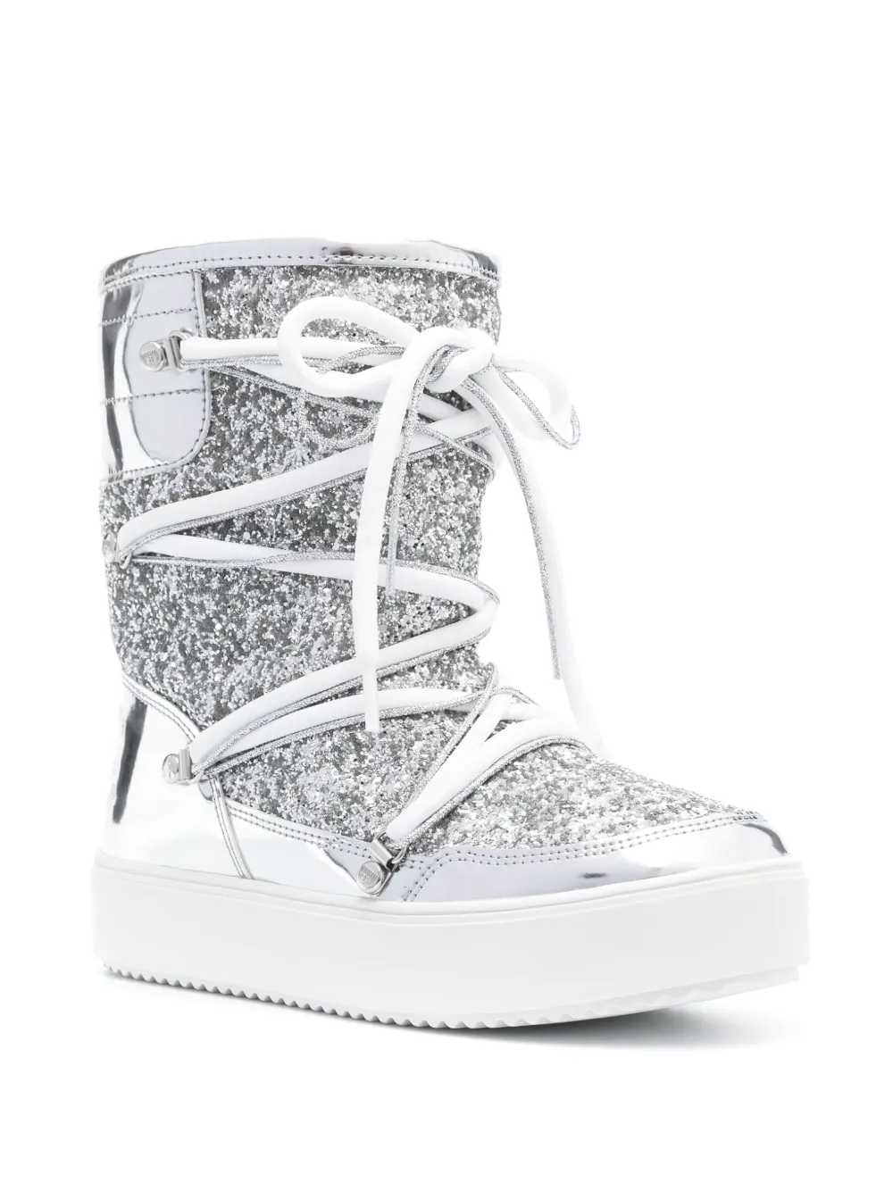 Серебристый, блестящий материал, серебристая фурнитура, нашивка с тисненым логотипом сзади, закругленный носок, шнуровка спереди, стелька с логотипом, резиновая подошва и высота по щиколотку.