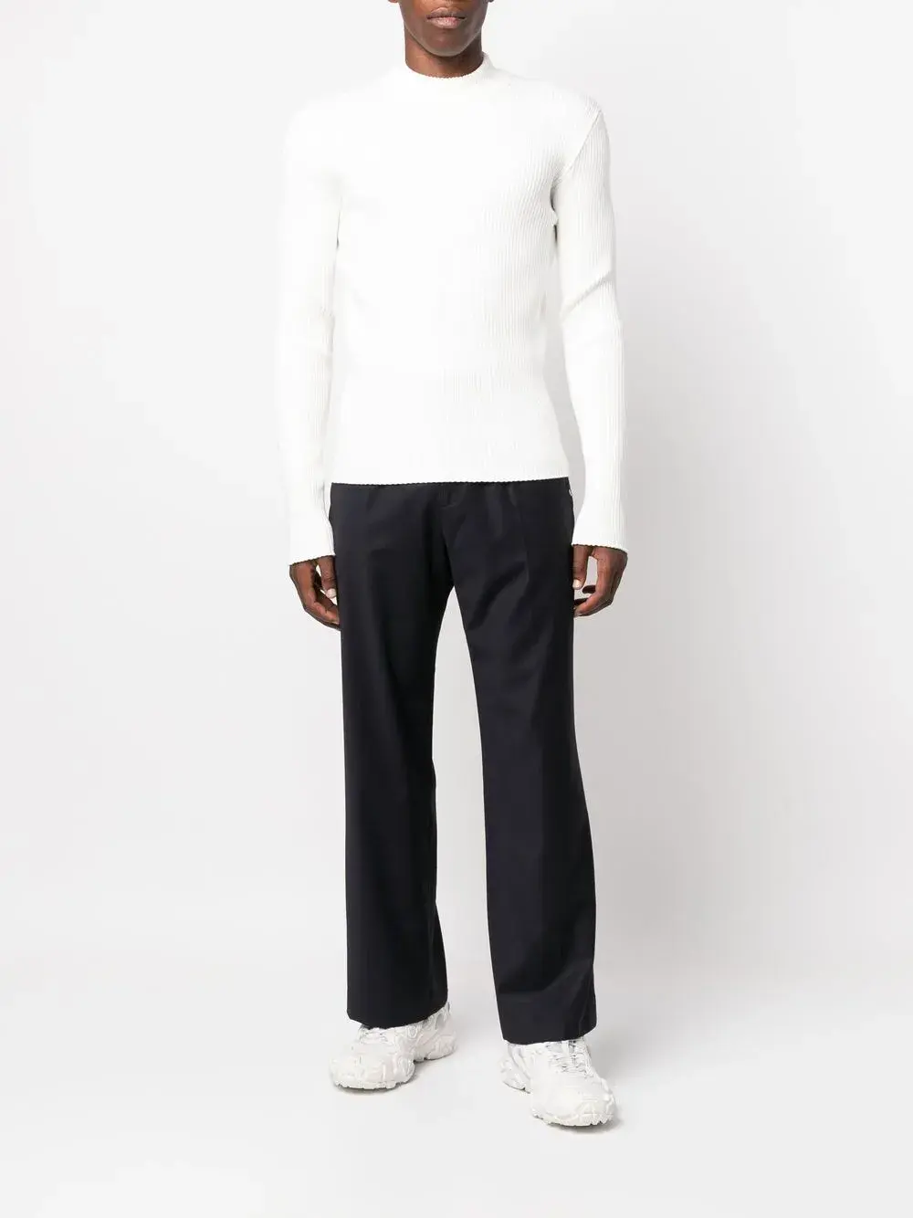 Белый, трикотаж в рубчик, нашивка с логотипом спереди, высокий воротник, длинные рукава и прямой подол.