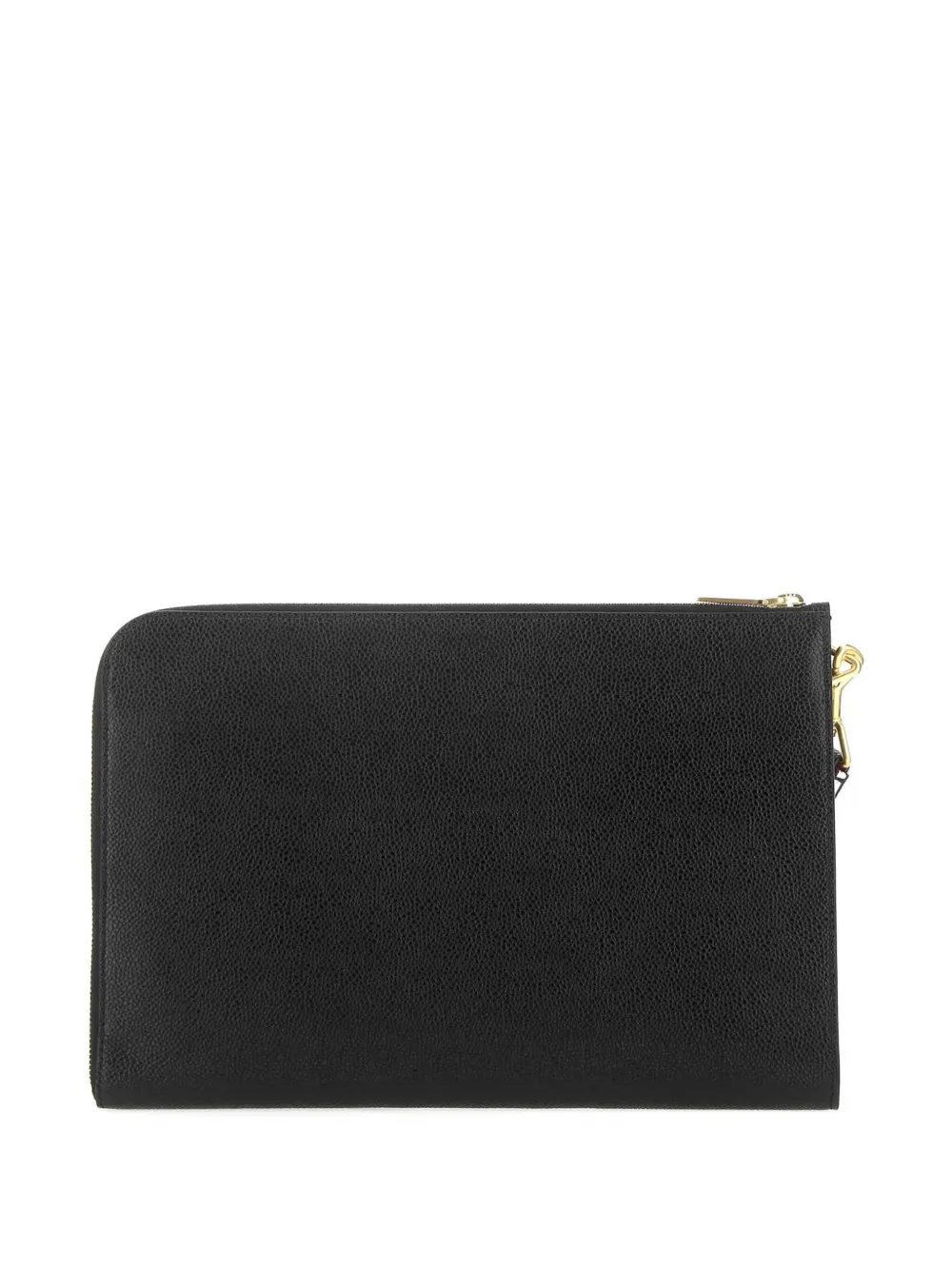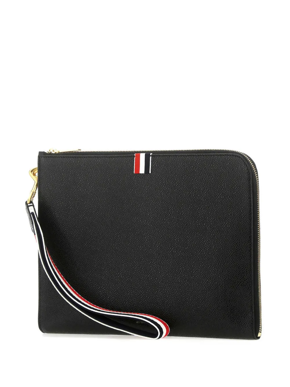 Портфолио среднего размера с полосками 'RWB' от Thom Browne (Том Браун). Ремешок на запястье, застежка на молнии сверху, золотистая фурнитура и печать с логотипом в центре спереди. Цвет: черный.