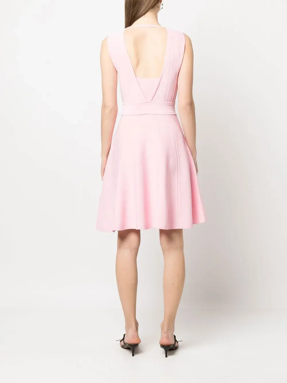 Светло-розовый, нашивка с логотипом спереди, расклешенный крой, длина по колено, низкий вырез на спине, круглый вырез и ремень на талии.