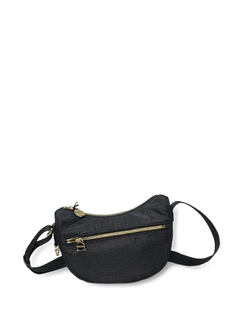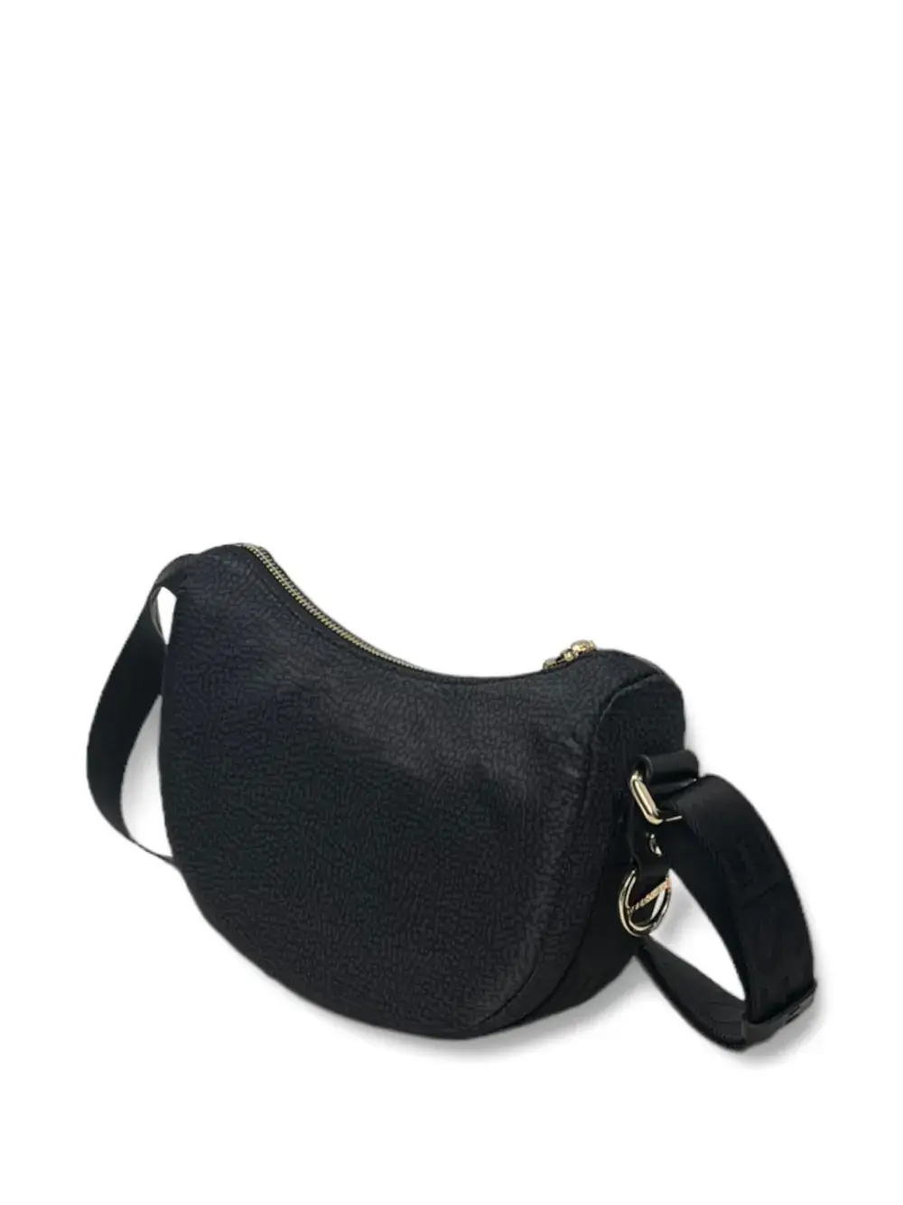 Черный фактурный материал, регулируемый плечевой ремень, застежка на молнию сверху, фурнитура цвета золота