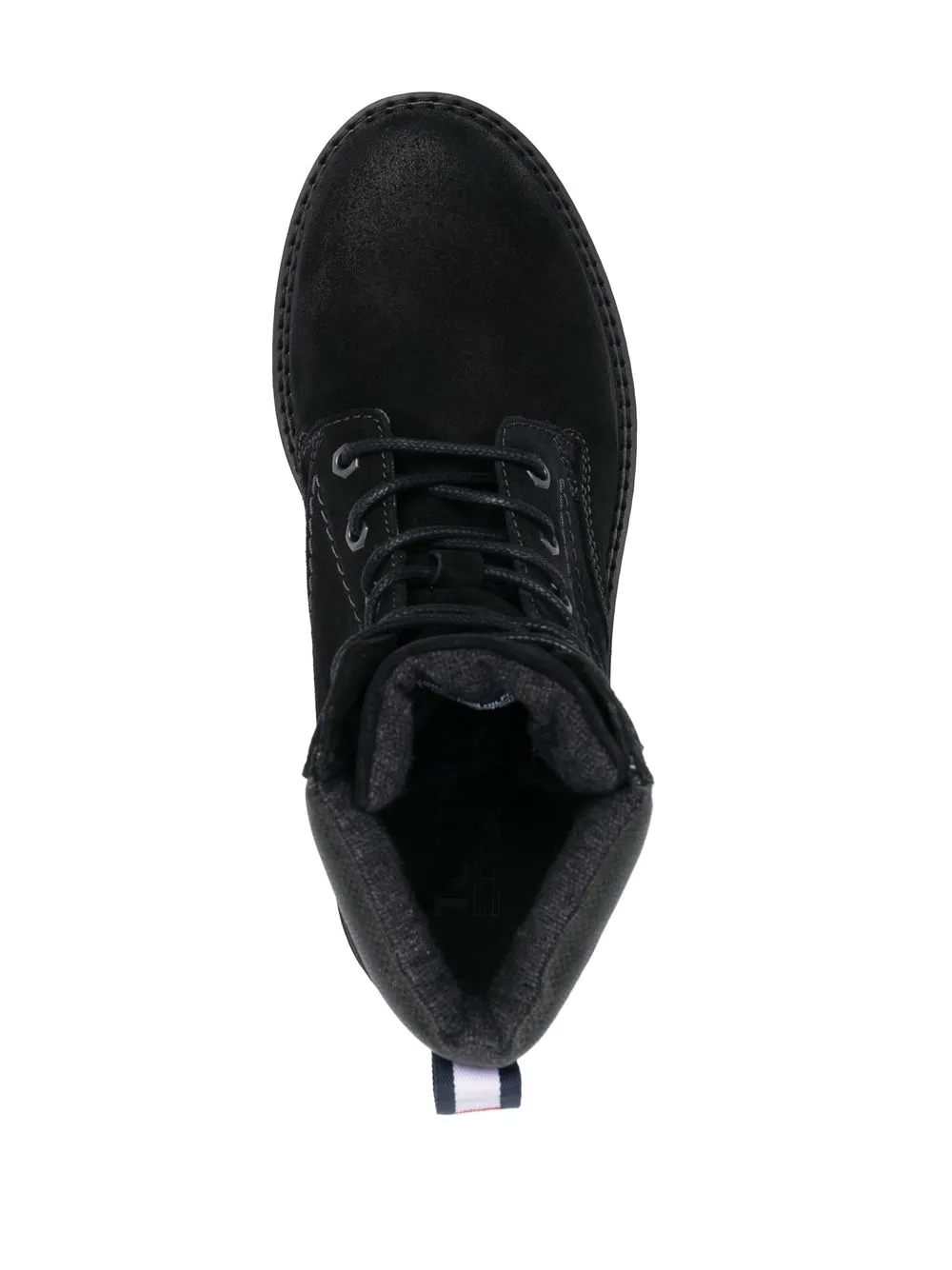 Черный, замша из телячьей кожи, телячья кожа, матовое покрытие, петля для подтягивания сзади, закругленный носок, шнуровка спереди, высота по щиколотку, рифленая резиновая подошва и низкий каблук.