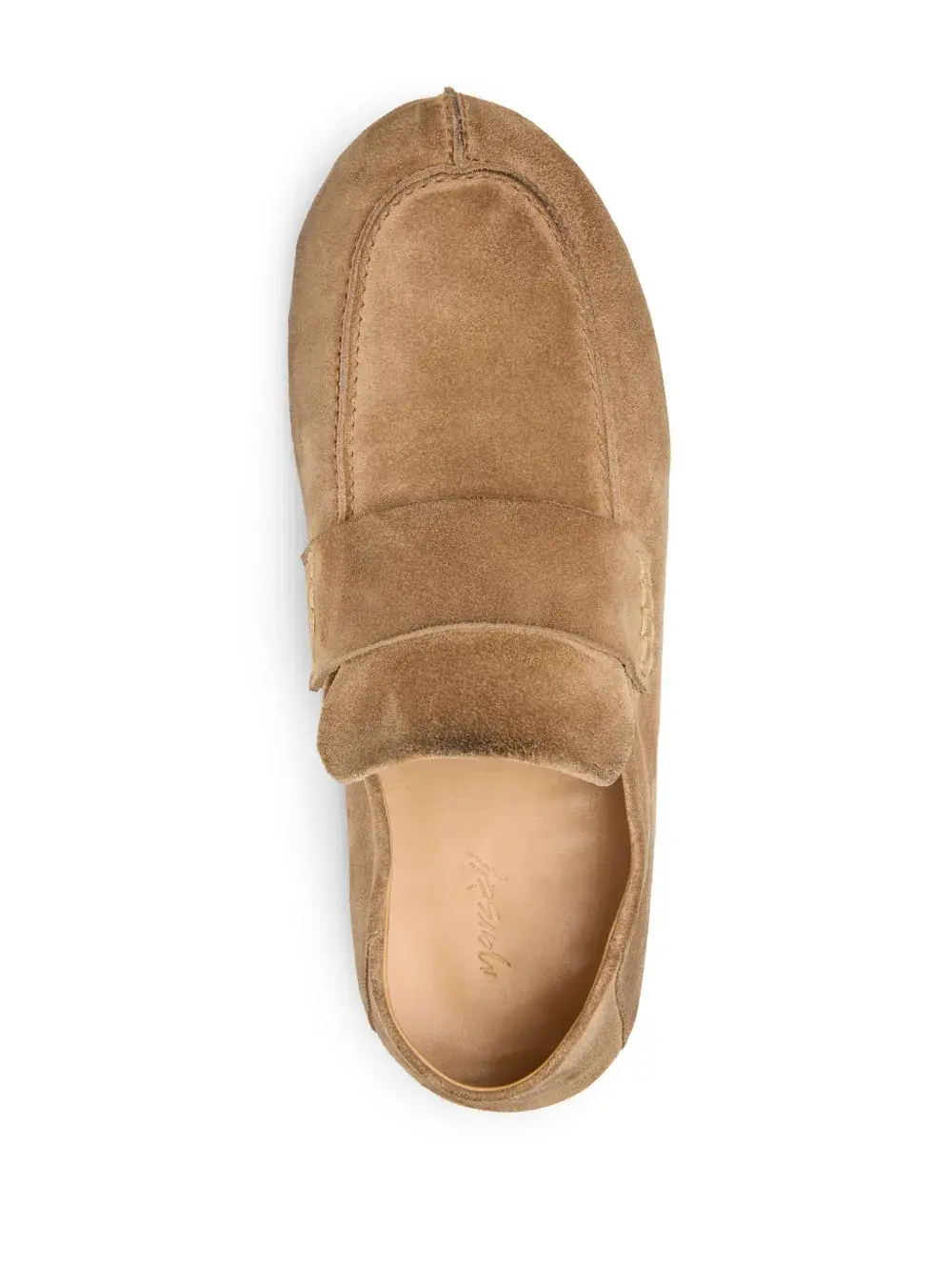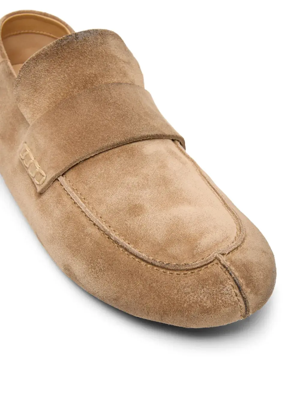 Бежево-коричневый, замша из телячьей кожи, телячья кожа, регулируемый ремешок спереди, закругленный носок, модель без застежки, плоская резиновая подошва, полукруговой шов на носке и кожаная стелька с логотипом.