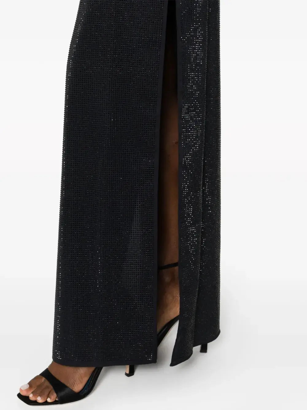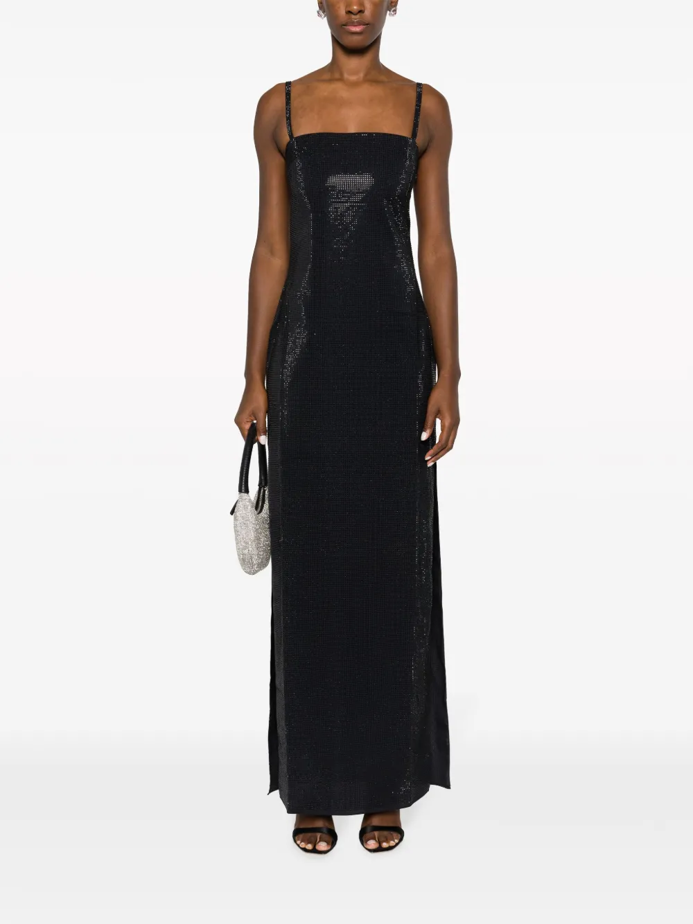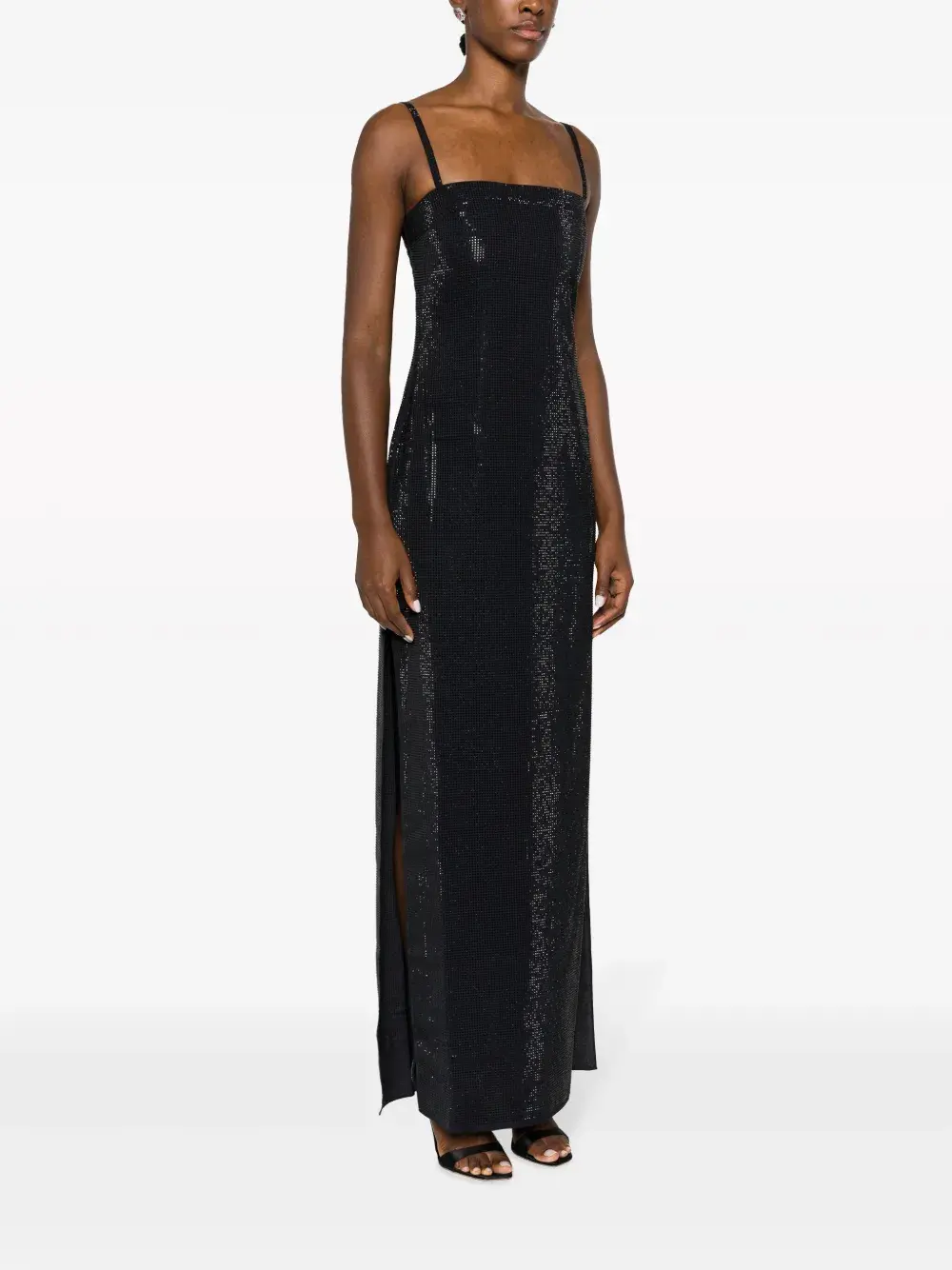 Глянцевая фактура, квадратный вырез, узкие бретели, без рукавов, боковой разрез, прямой подол и высота по щиколотку.