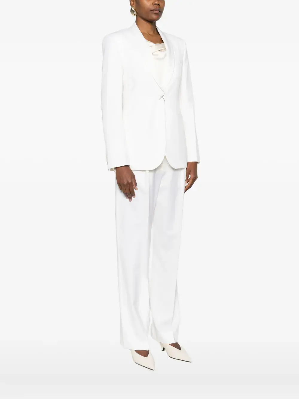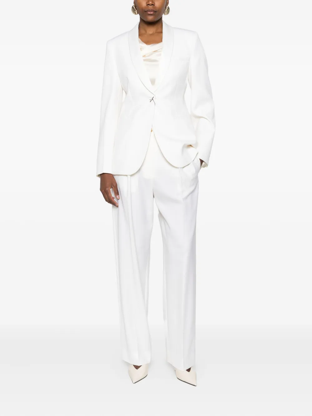 Белый пиджак с шалевым воротником, застежкой спереди, длинными рукавами, передними карманами и прямым подолом