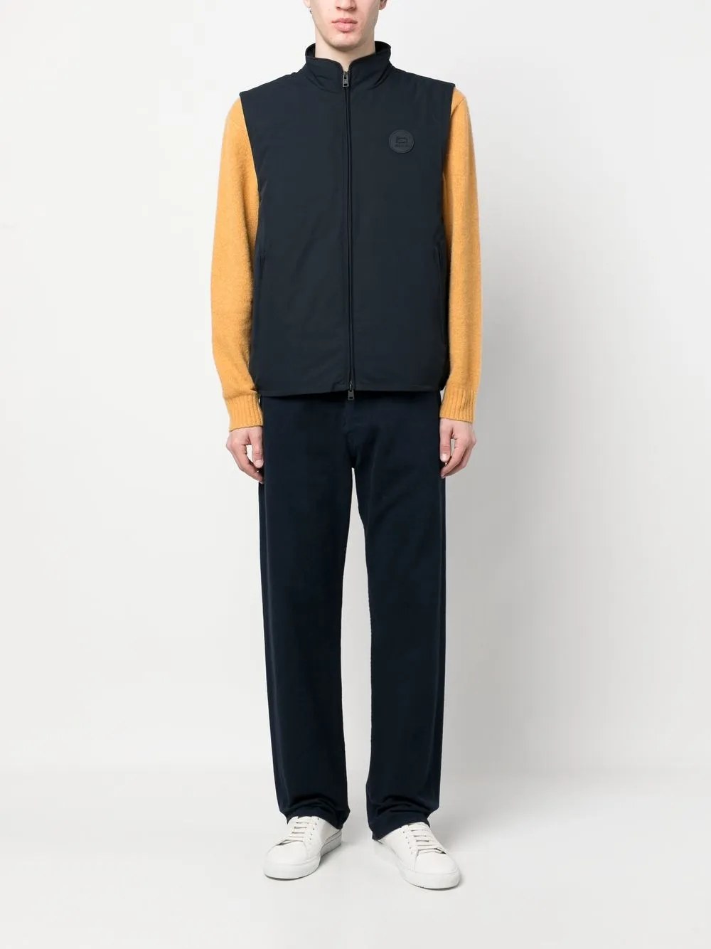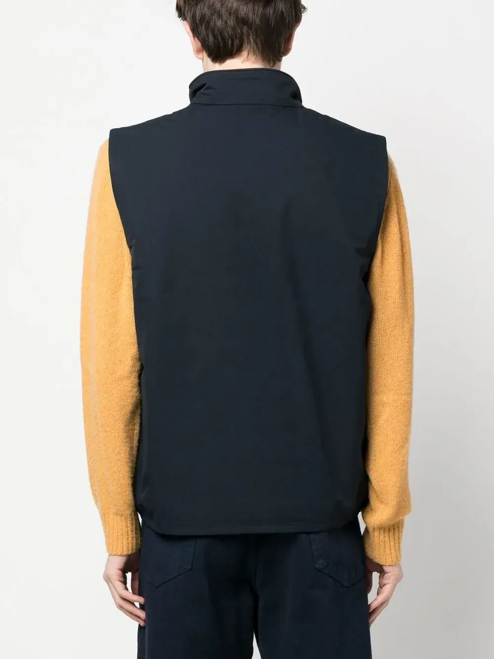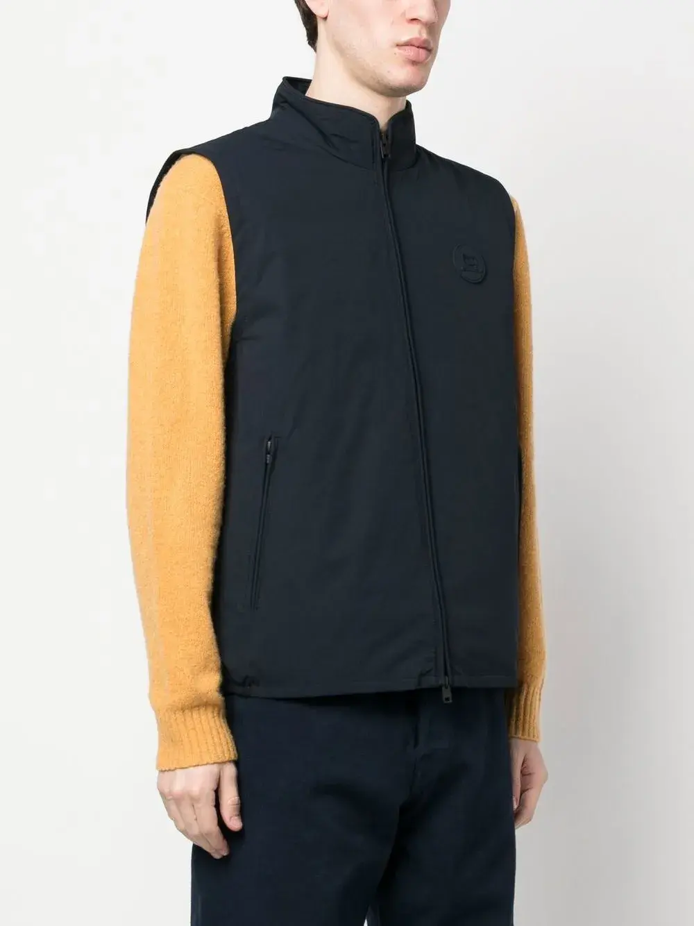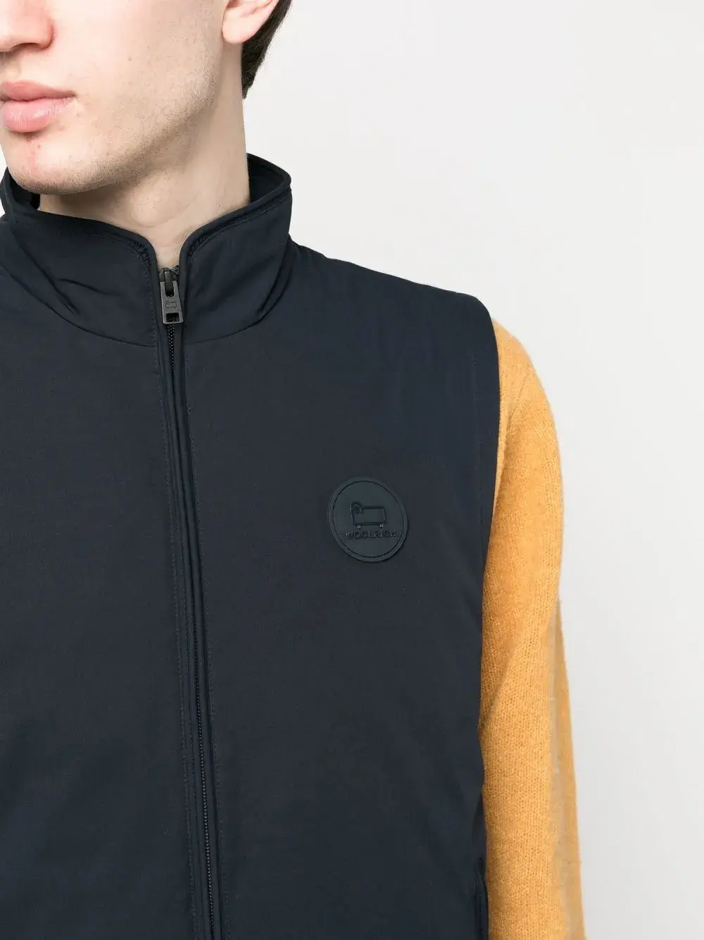Синий, дутый материал, нашивка с логотипом на груди, застежка на молнии спереди, без рукавов и прямой подол.