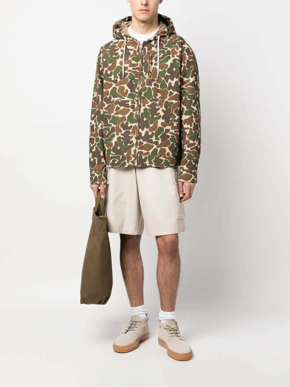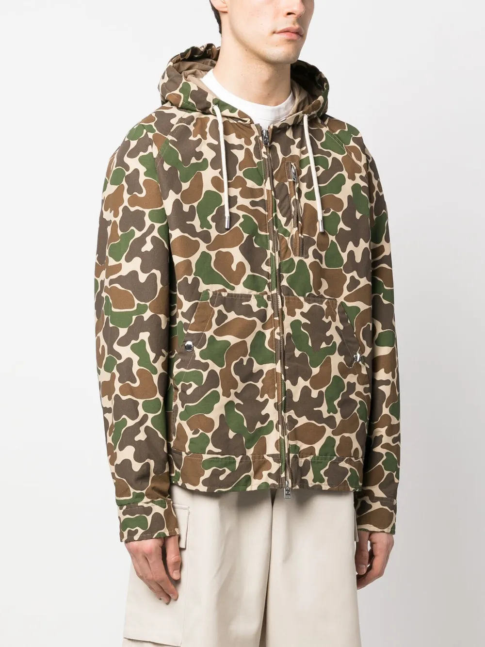 Бежевый, разноцветный, хлопок, камуфляжный принт, затягивающийся на шнурок капюшон, нашивка с логотипом на рукаве, застежка на молнии спереди, длинные рукава и прямой подол.