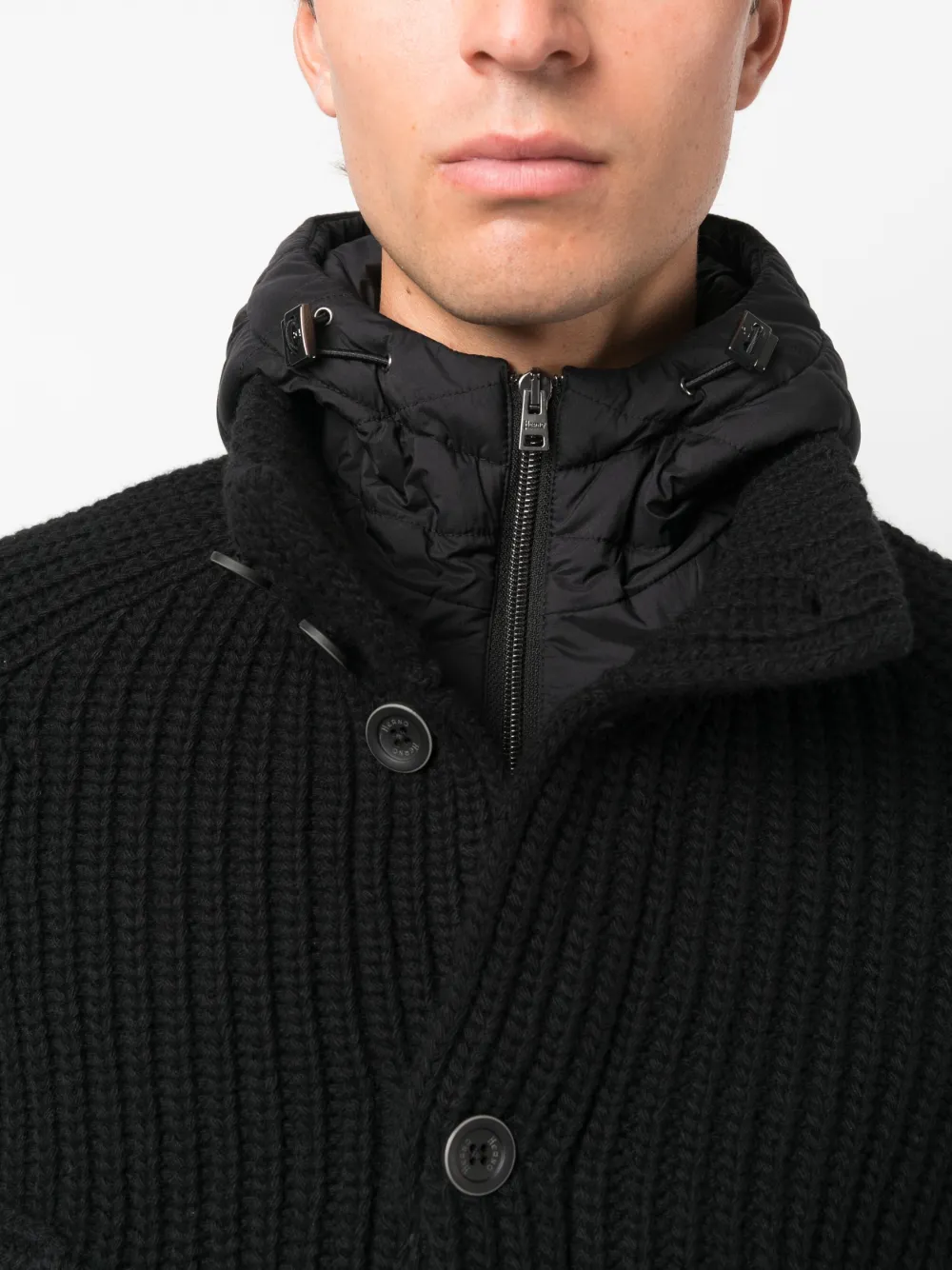 Черный, шерсть, двойные стенки с изоляцией, трикотажный материал, затягивающийся на шнурок капюшон, застежка на пуговицах спереди, потайная молния спереди, длинные рукава, два вшитых кармана по бокам, два передних кармана с клапанами, внутренний карман на молнии и прямой подол.
