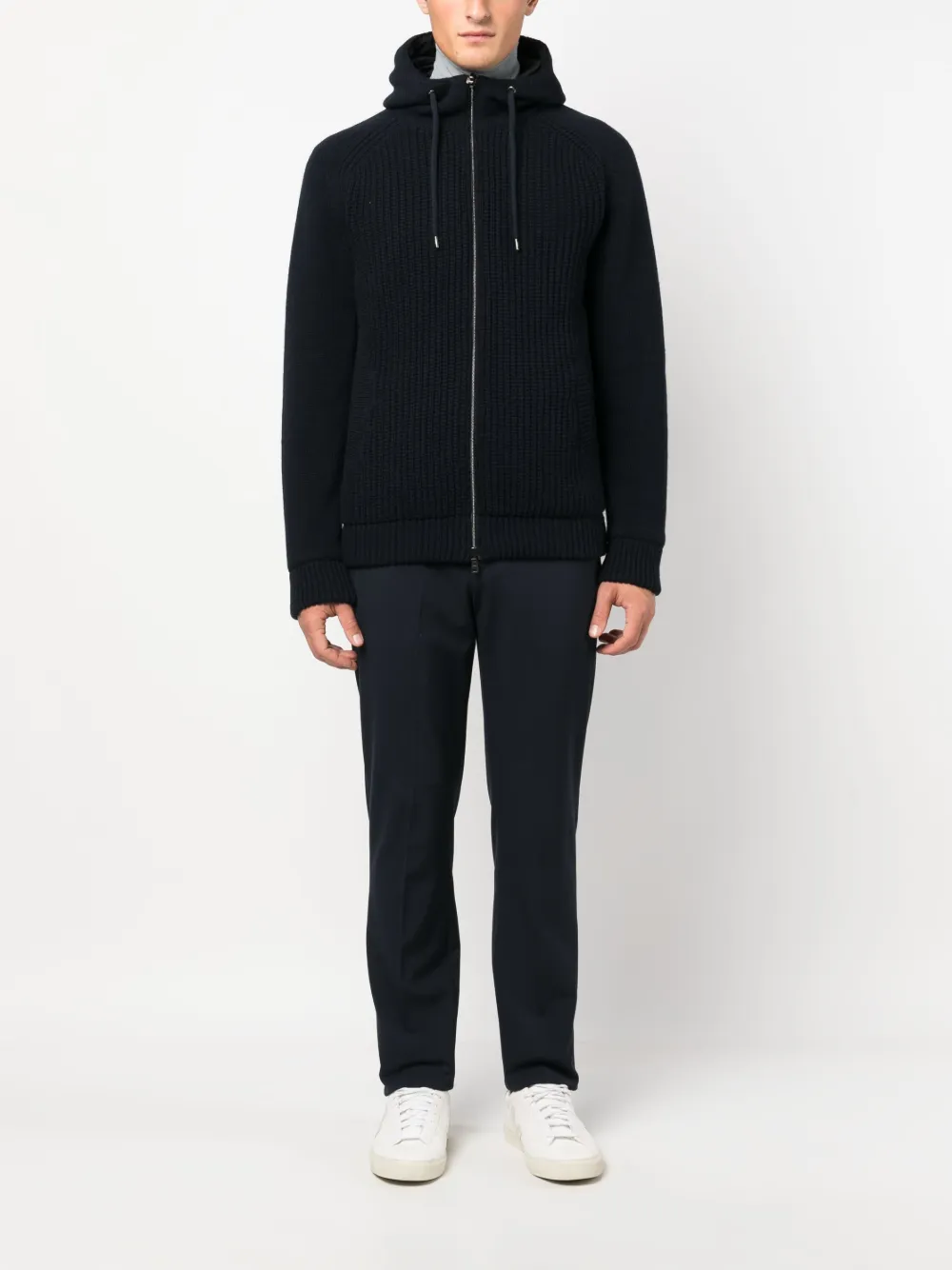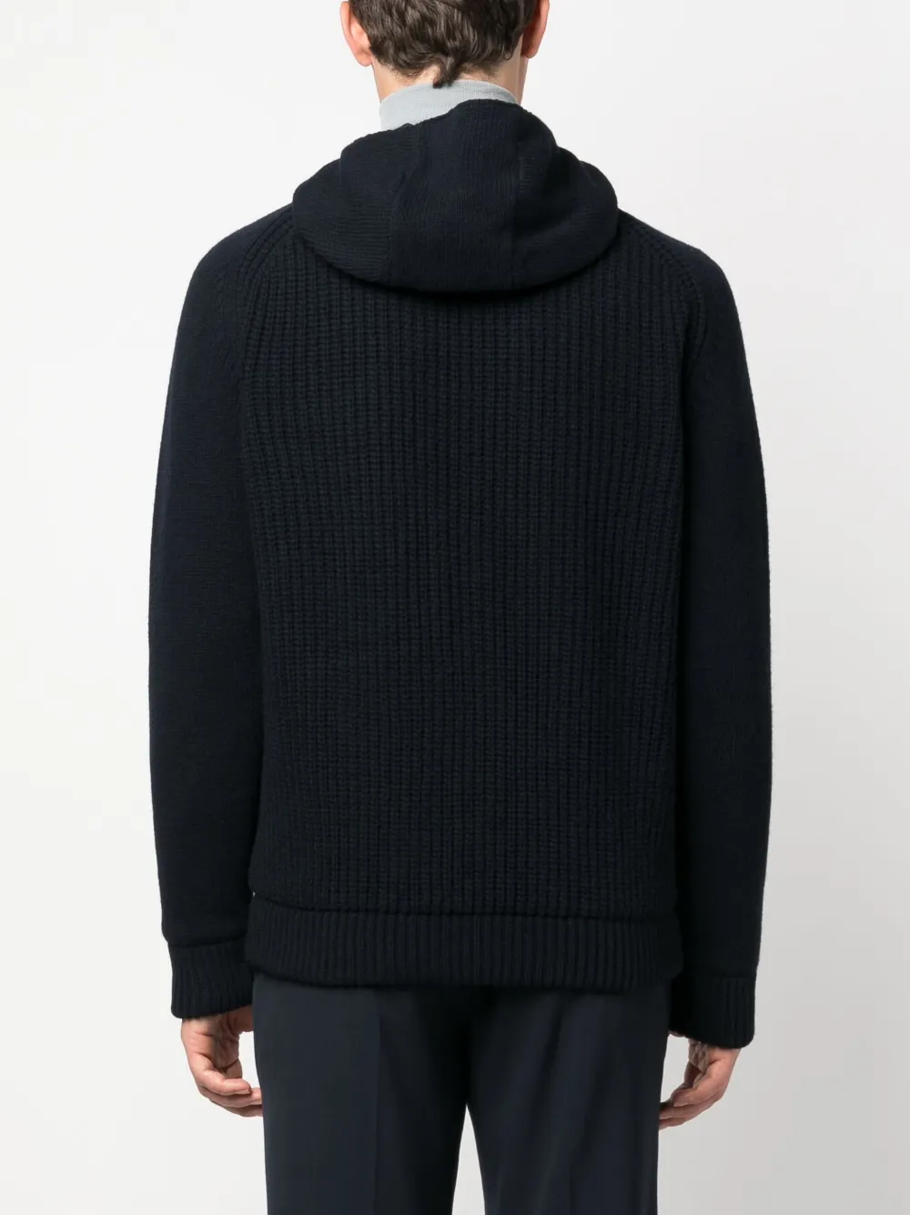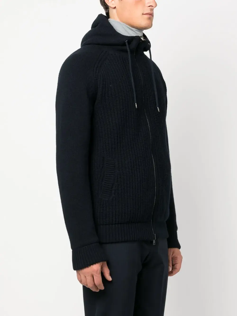 Темно-синий, шерсть, вафельная вязка, двусторонний дизайн, затягивающийся на шнурок капюшон, высокий воротник, двусторонняя молния спереди, длинные рукава и прямой подол.