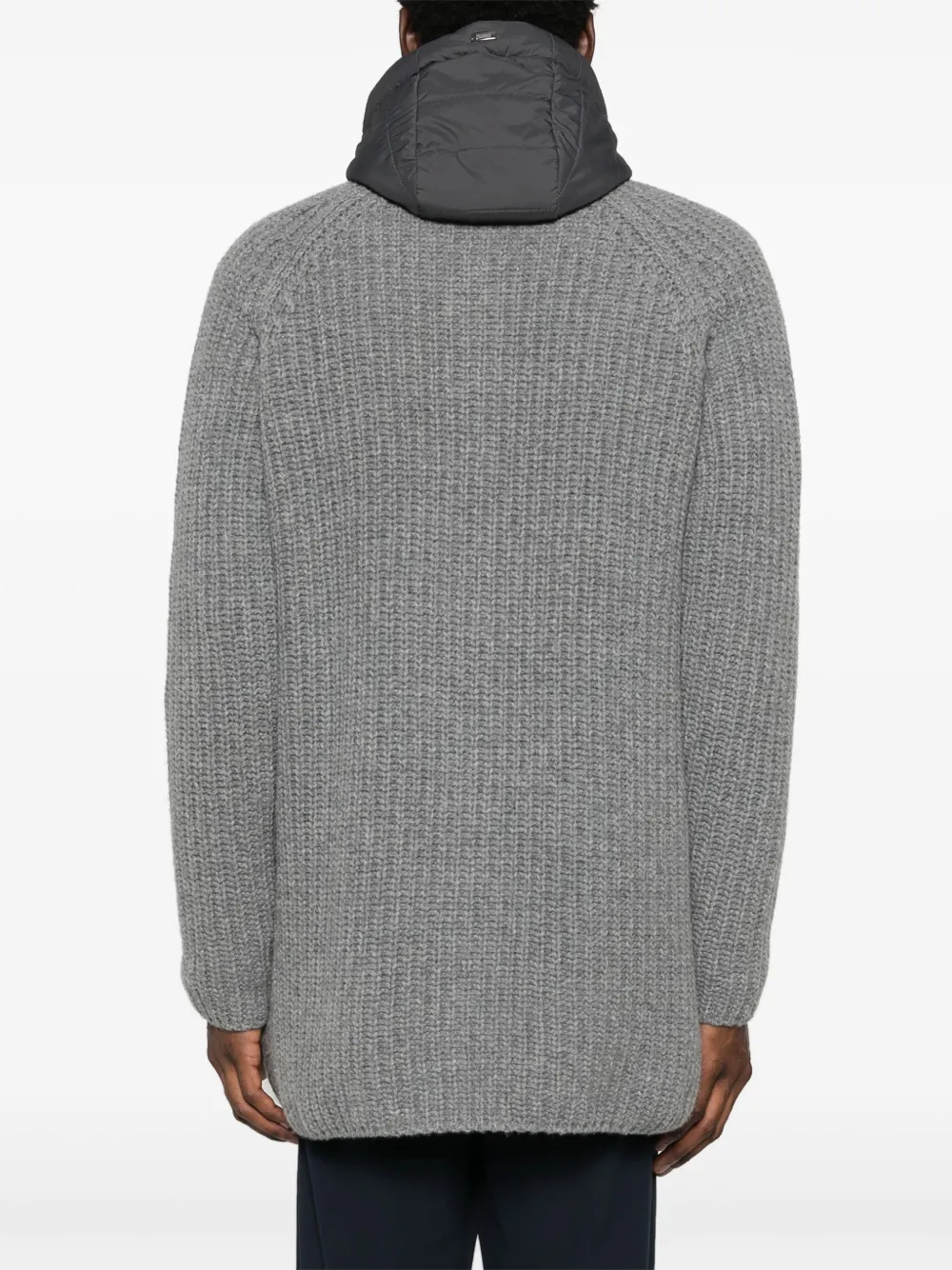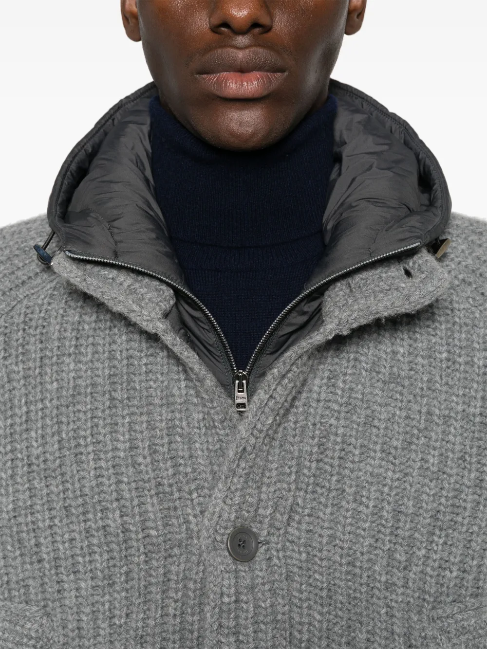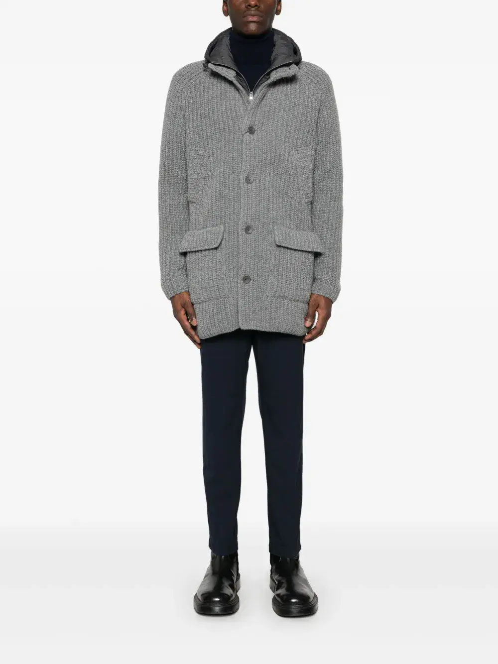 Подробнее о товаре: • серый • вирджинская шерсть • трикотаж в крупный рубчик • двойные стенки с изоляцией • двухслойный материал • застежка на пуговицах спереди • потайная молния спереди • съемный контрастный капюшон с кулиской • воротник-стойка • длинные рукава • два прорезных кармана сбоку • два передних кармана с клапанами • стеганая подкладка • внутренний карман на молнии • прямой подол