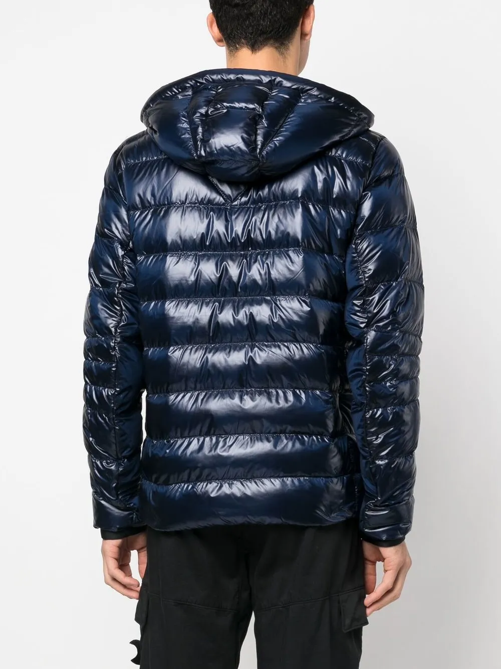 Синий, наполнитель из пуха и перьев, глянцевая фактура, водоотталкивающий материал, дутый материал, нашивка с логотипом на рукаве, воротник-стойка, затягивающийся на шнурок капюшон, двусторонняя молния, длинные рукава, рукава с узкими манжетами и два кармана на молнии по бокам.