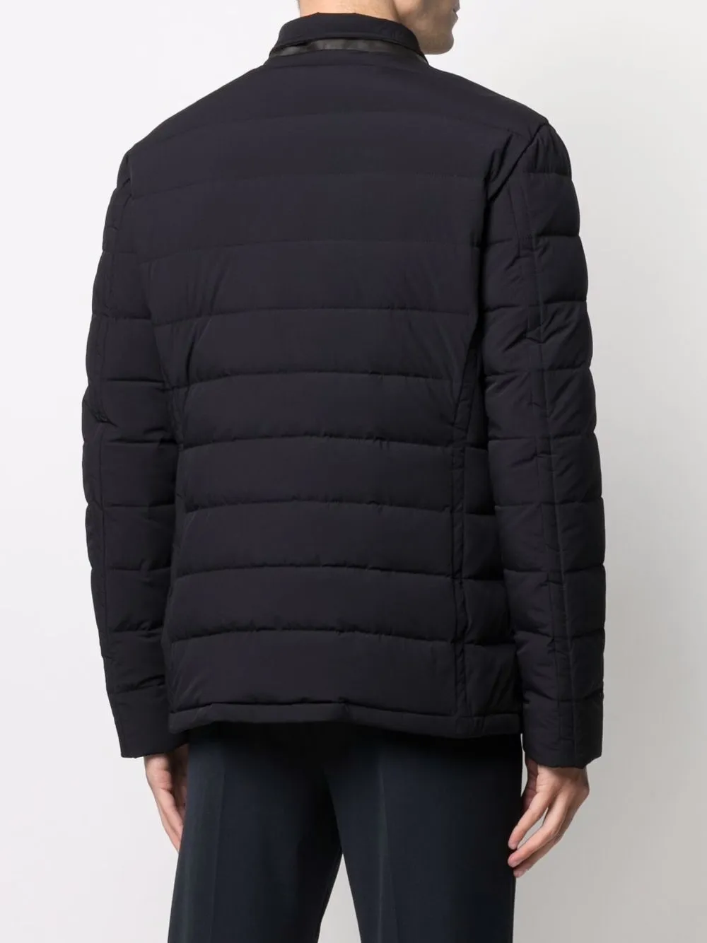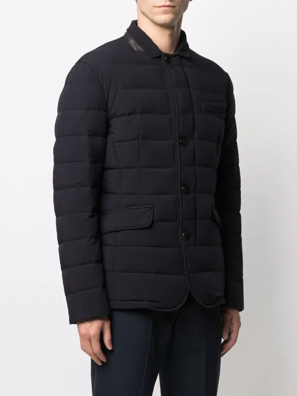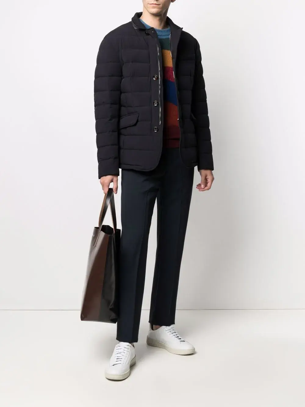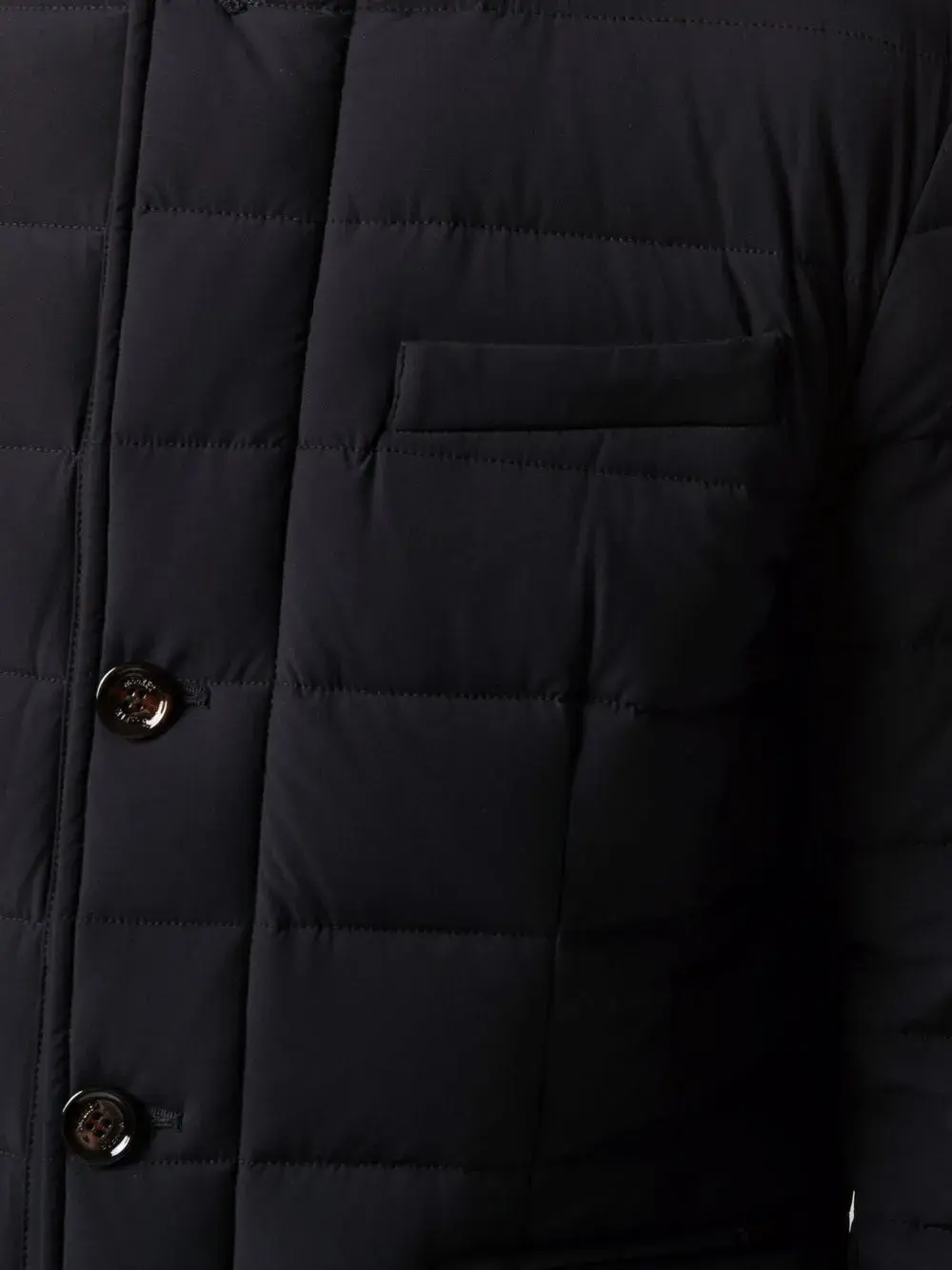 Легкий материал, дутый материал, классический воротник, застежка на молнии и пуговице спереди, длинные рукава, нагрудный прорезной карман, два передних кармана с клапанами и наполнитель из смеси пуха и пера.