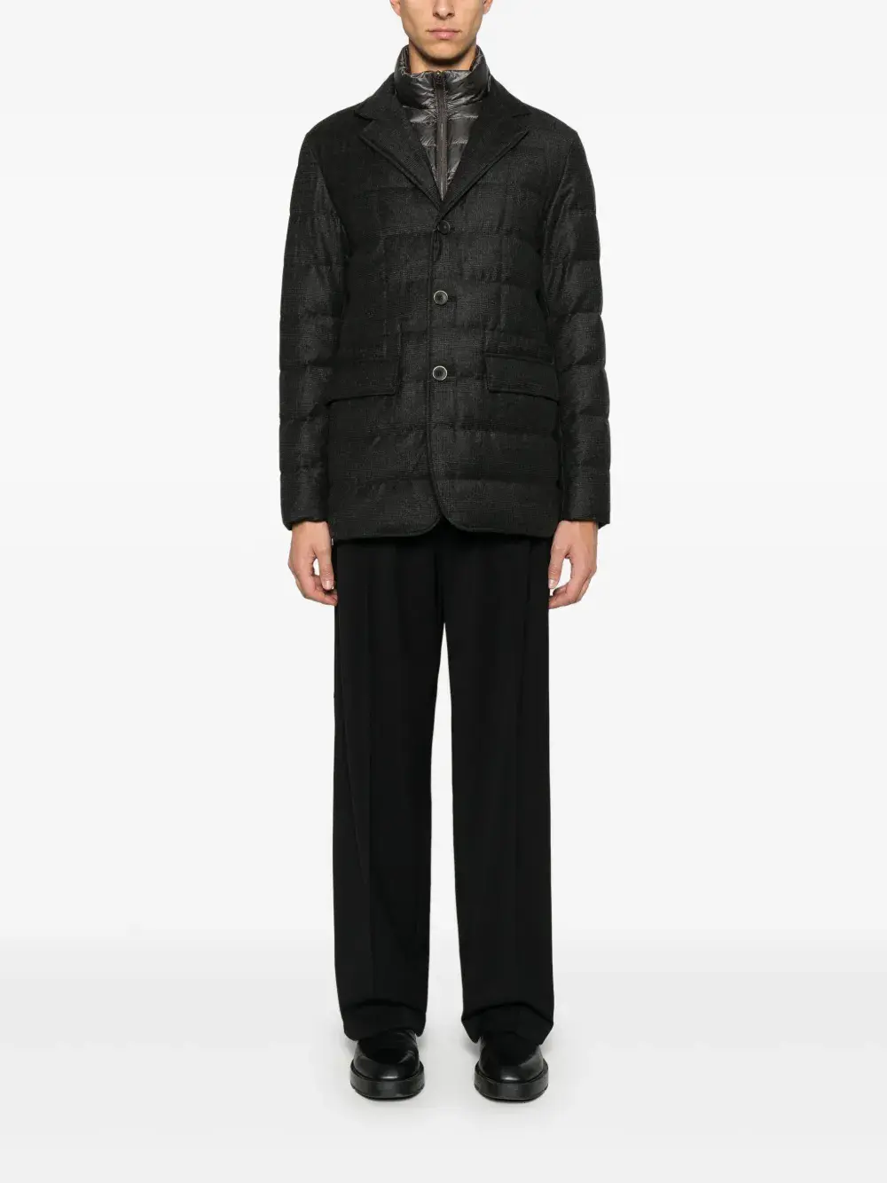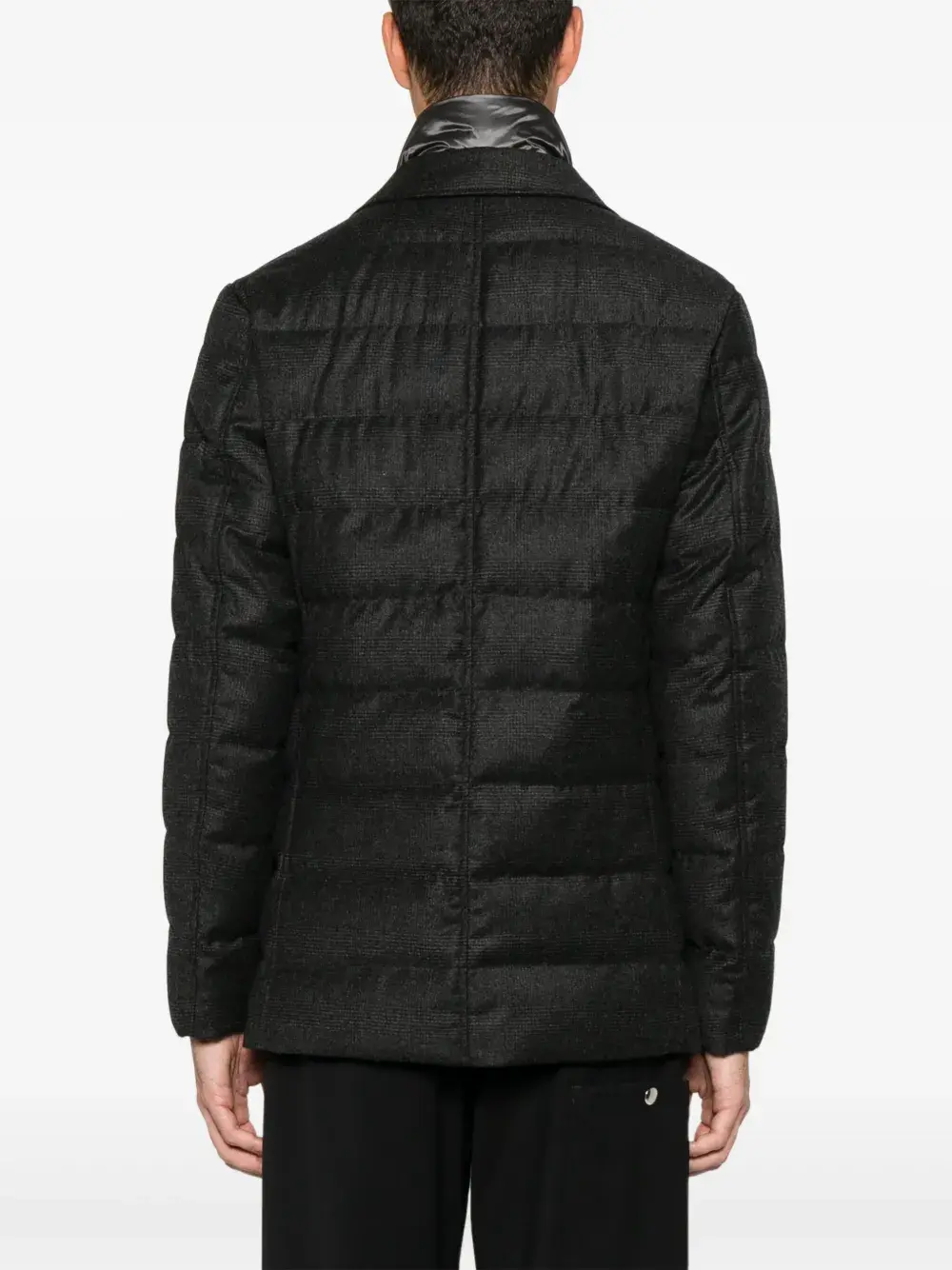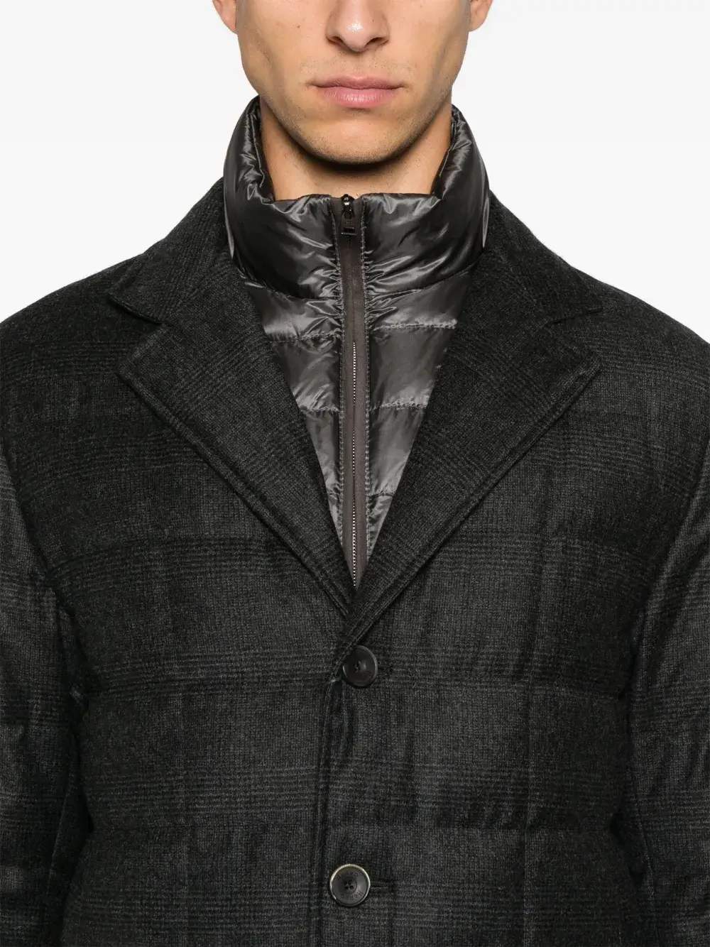 Подробнее о товаре: • антрацитово-серый • смесь вирджинской шерсти и кашемира • дутый материал • наполнитель из пуха • многослойный дизайн • клетчатый узор • застежка на пуговицах спереди • застежка на молнии спереди • съемный внутренний слой • воротник-стойка • зазубренные лацканы • длинные рукава • два передних кармана с клапанами • внутренний карман на молнии • цельная подкладка • прямой подол