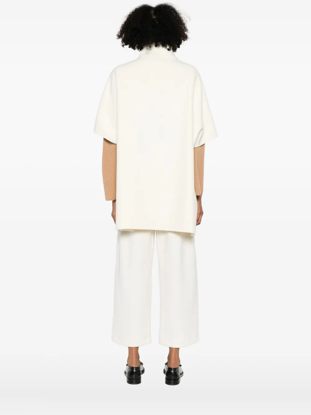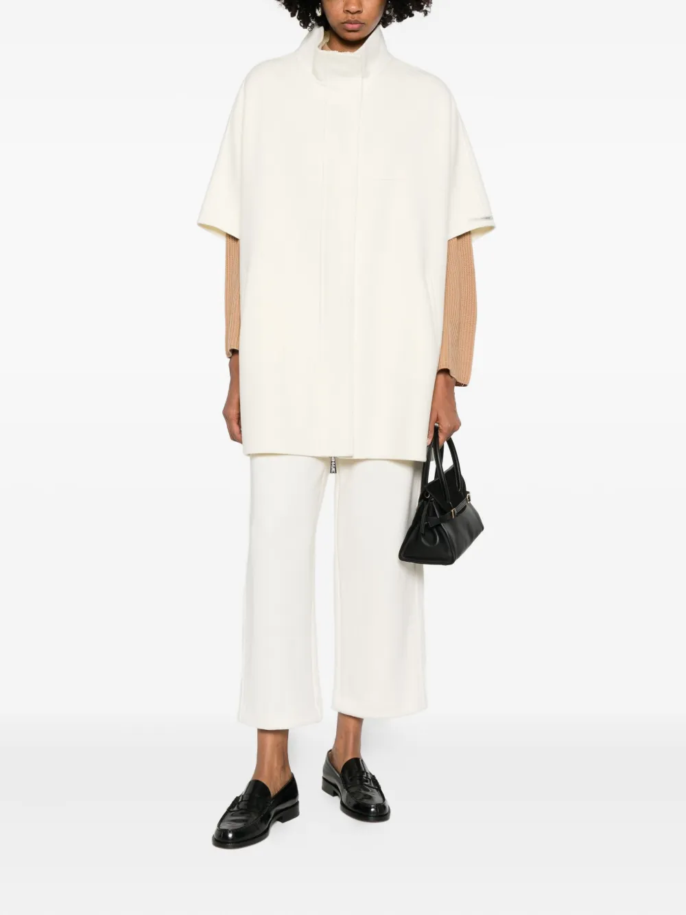 Белый высокий воротник, панельный дизайн, короткие рукава, застежка на молнию, боковые карманы