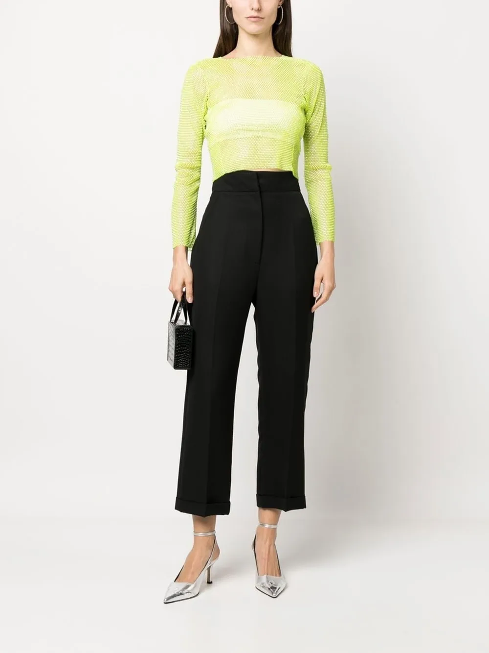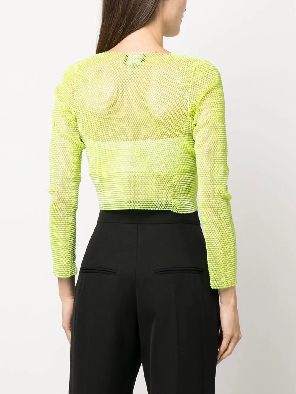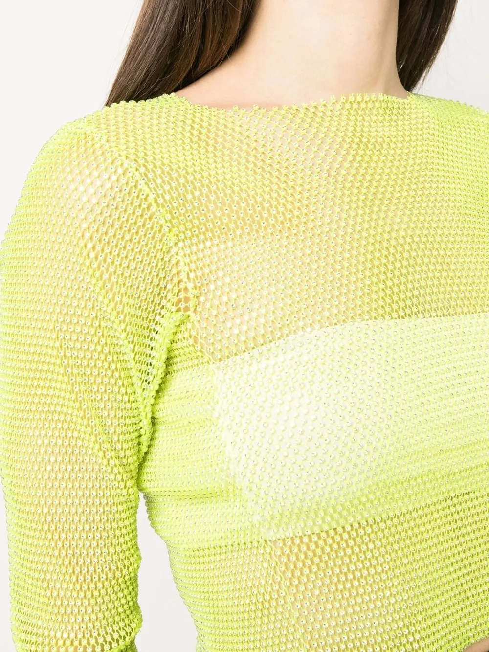 Зеленый, полупрозрачный дизайн, декор из кристаллов, декор из кристаллов, круглый вырез, длинные рукава и укороченная длина.