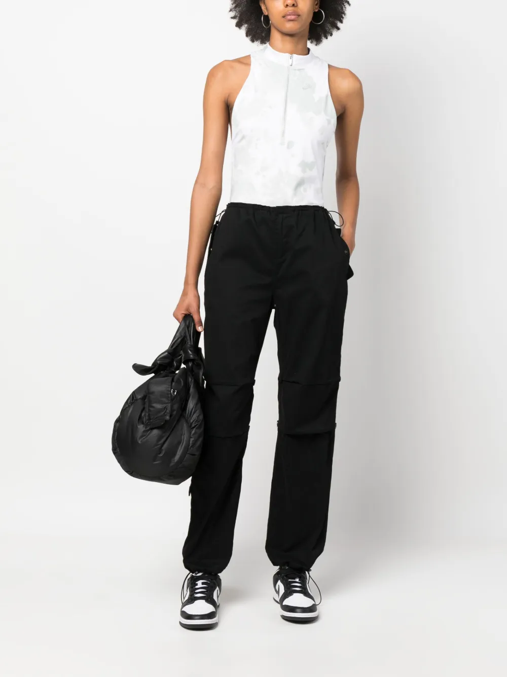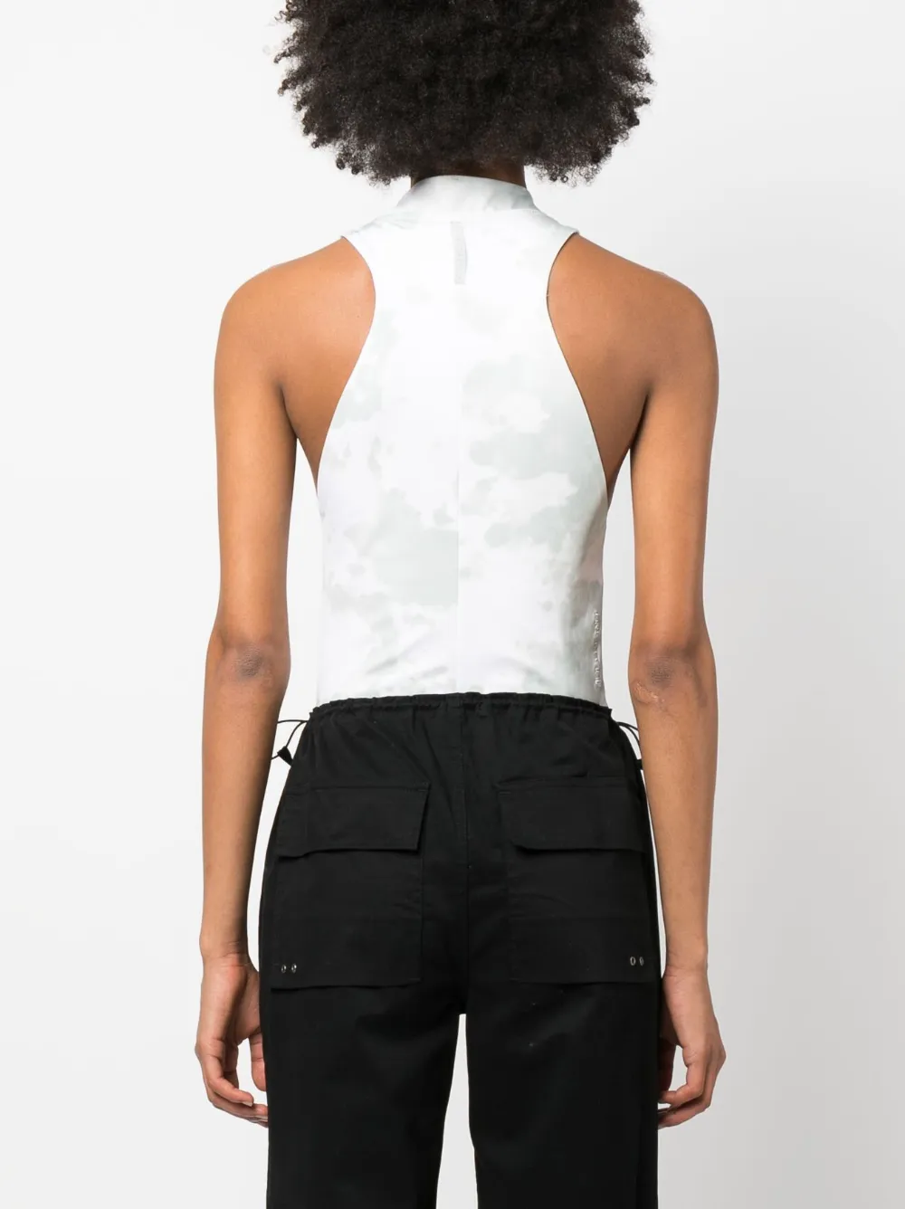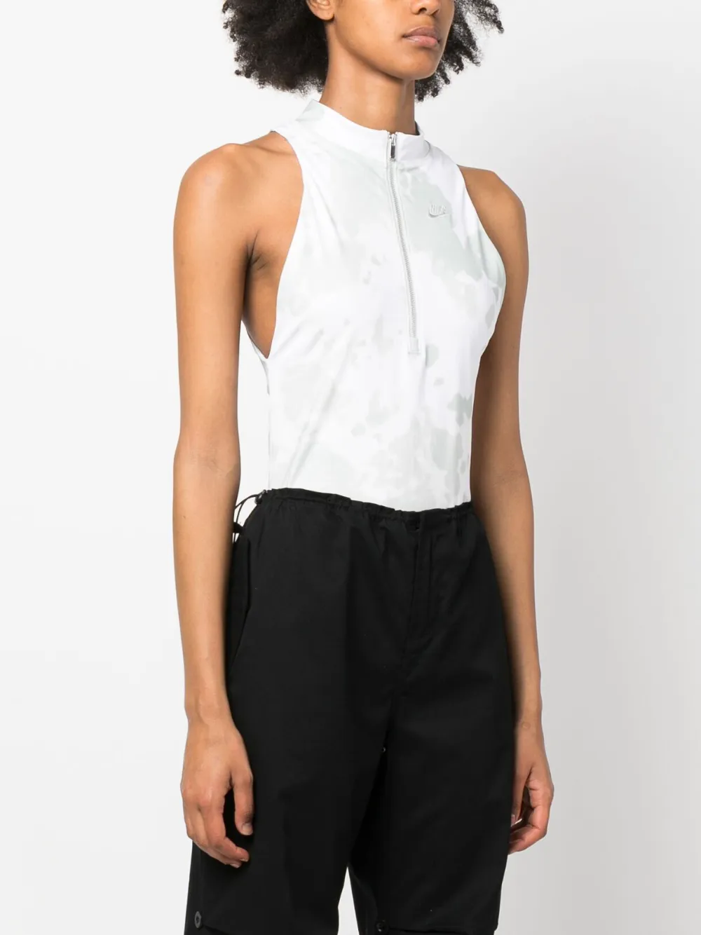 Белый, принт тай-дай, вышитый логотип на груди, высокий воротник, короткая застежка на молнии спереди, без рукавов и прямой подол.