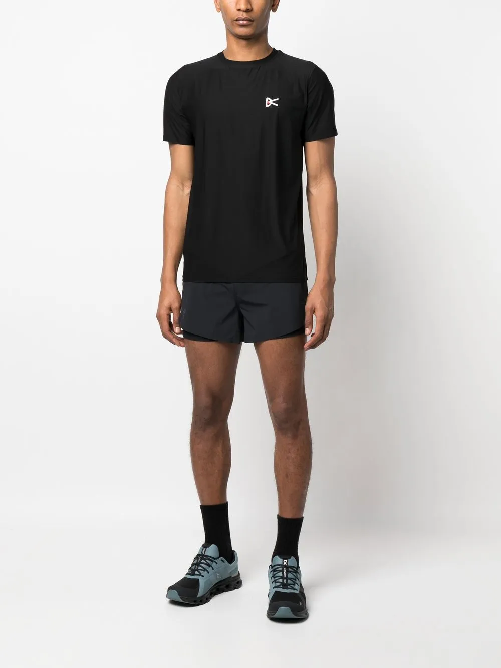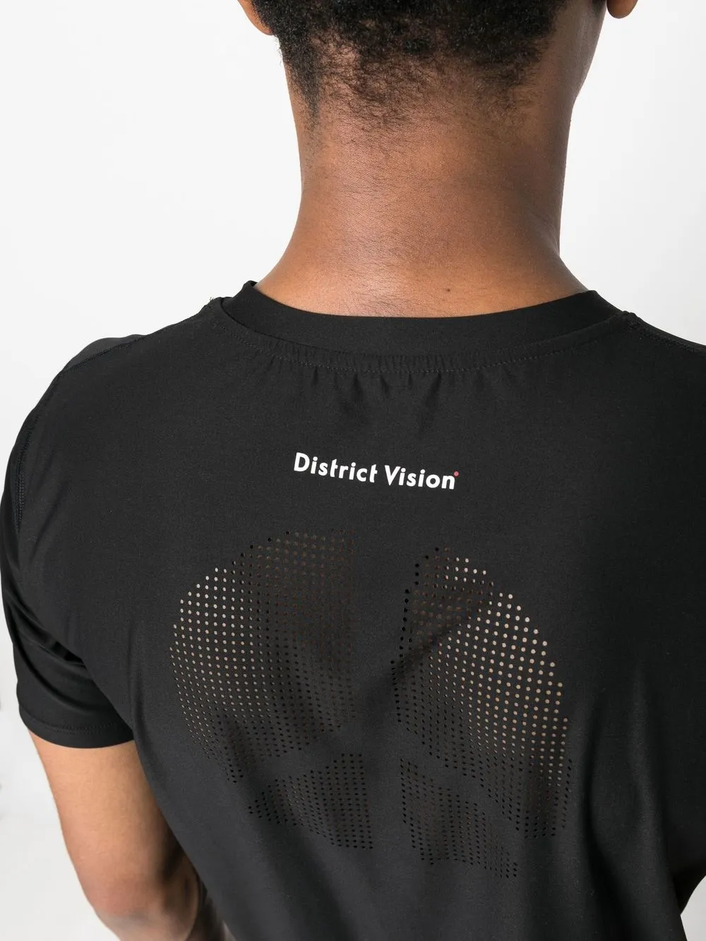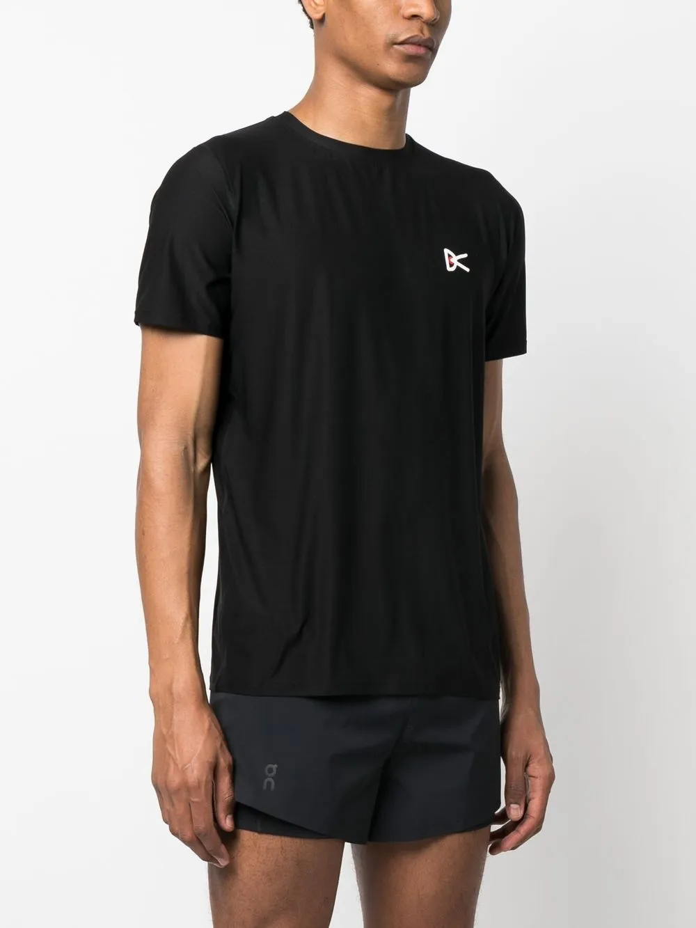 Черный, эластичный материал, принт с логотипом на груди, принт с логотипом сзади, перфорация, круглый вырез, модель без застежки и короткие рукава.
