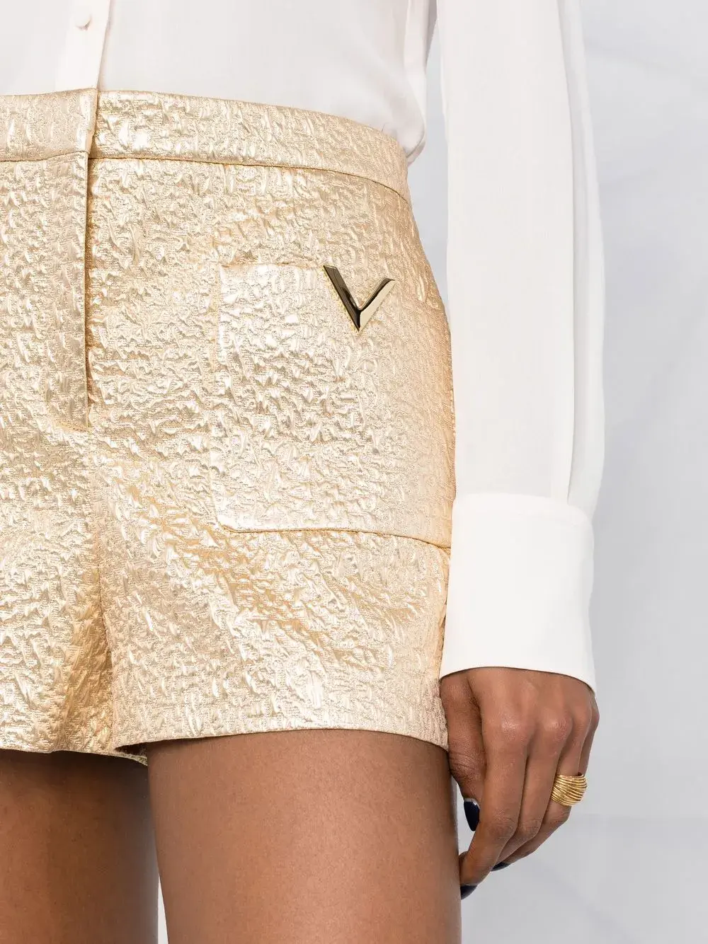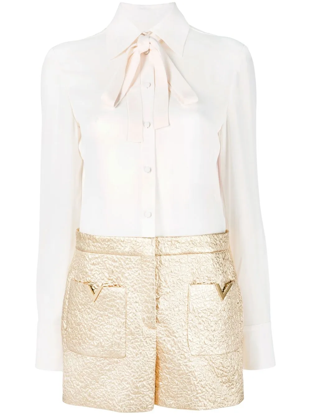Коллекция Valentino Ready To Wear, классический воротник, воротник с бантом, потайная пуговичная застежка спереди, два передних кармана и рукава с манжетами на пуговицах.