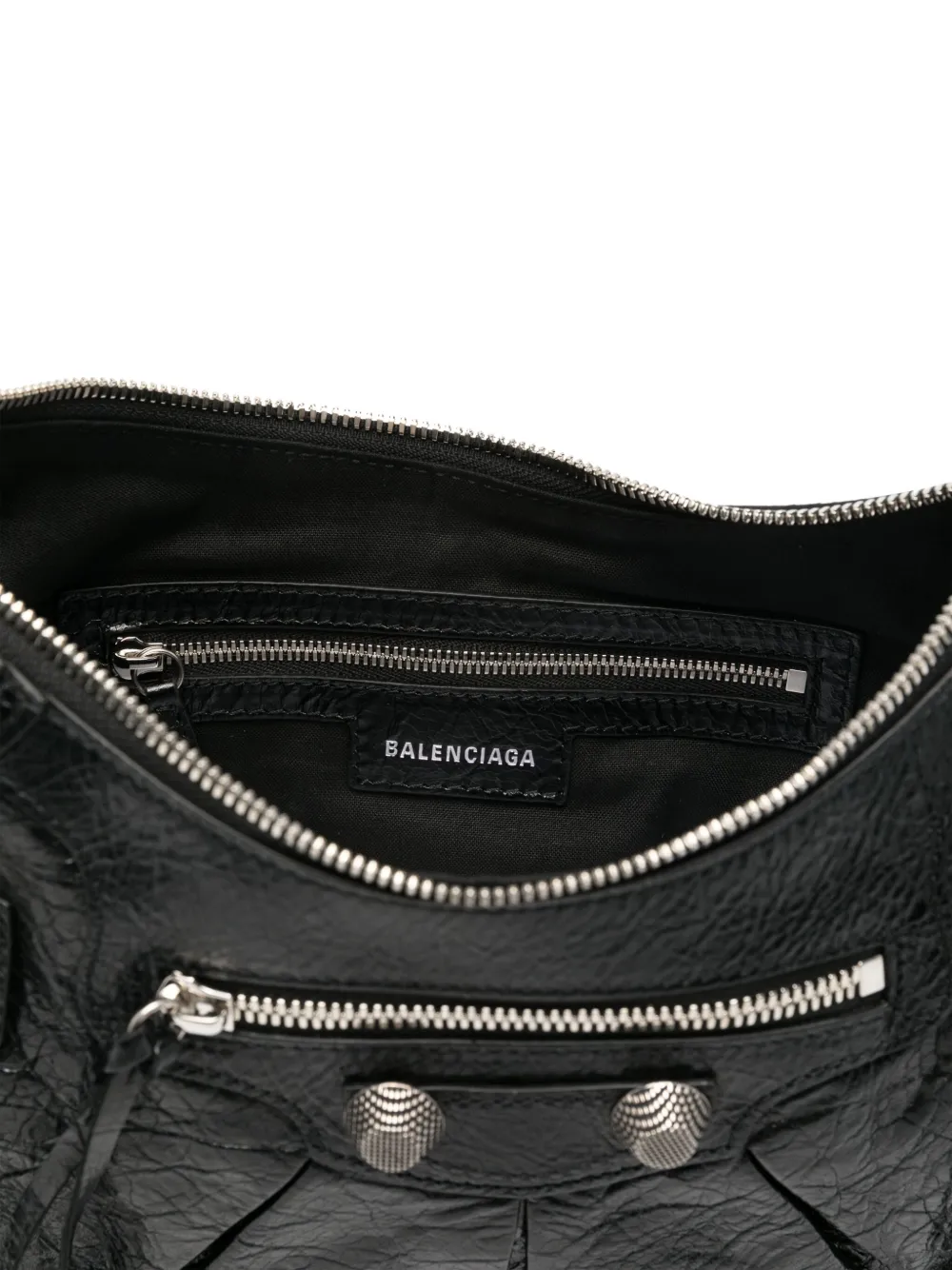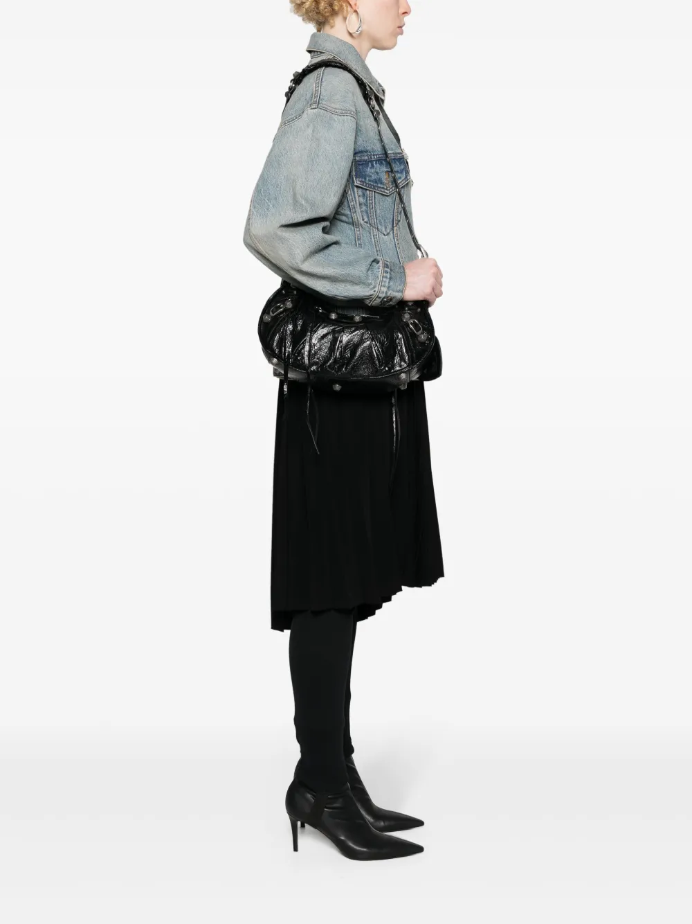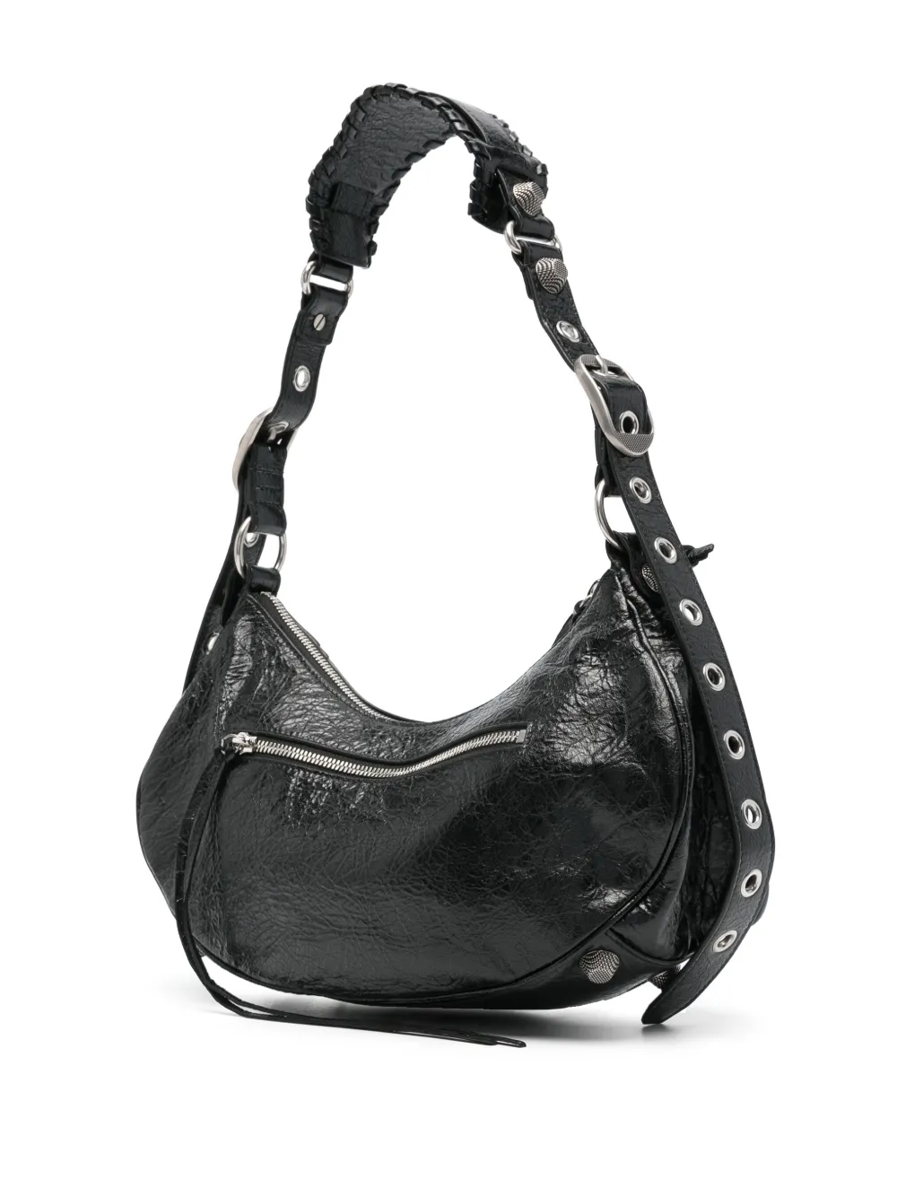 Подробнее о товаре: • черный • телячья кожа • ремешок с тиснением под крокодила • регулируемый ремень на плечо • отделка металлическими люверсами • зеркальная бирка • заклепки и складки спереди • декоративная пряжка • карман на молнии спереди • карман на молнии сзади • основное отделение • внутренний карман на молнии • внутренняя бирка с логотипом • цельная подкладка • серебристая фурнитура • застежка на молнии сверху • В комплект входит мешок-пыльник для хранения.