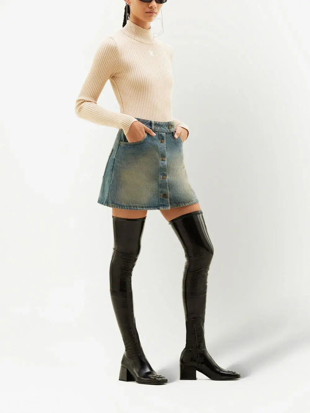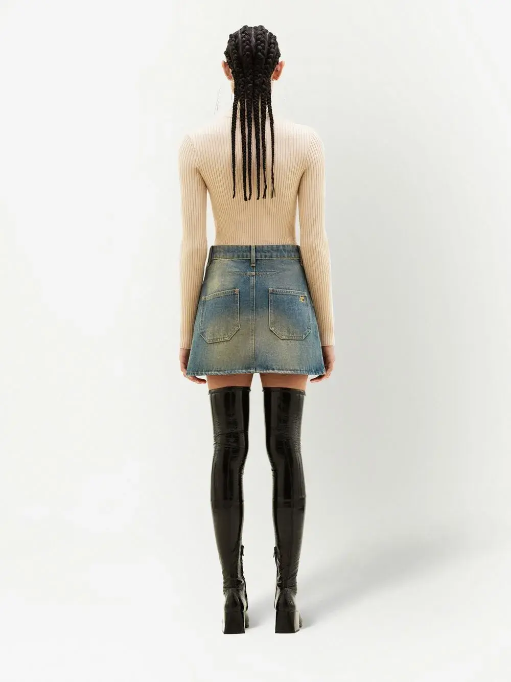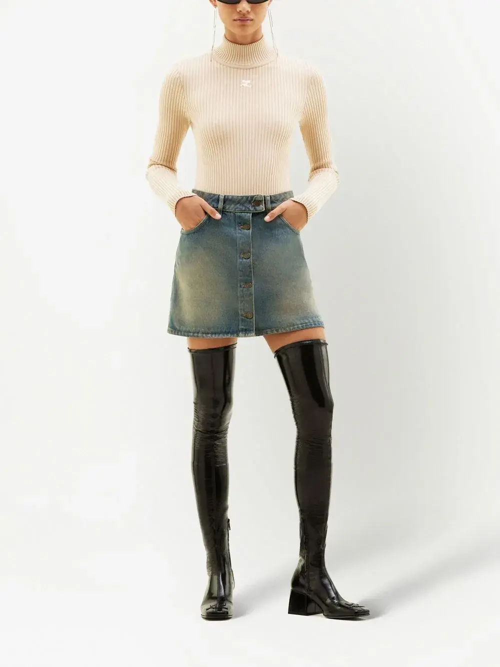 Песочно-бежевый, трикотаж в рубчик, нашивка с логотипом на груди, узкий крой, высокий воротник, длинные рукава и прямой подол.