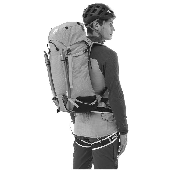 Millet Prolighter 30+10 оснащен боковой системой крепления лыж. Также можно прикрепить ледорубы и лыжные палки (спереди), а веревки - сверху и по бокам. Чтобы сэкономить немного лишнего веса, при необходимости можно снять нагрудный ремень, поясной ремень и верхний клапан.