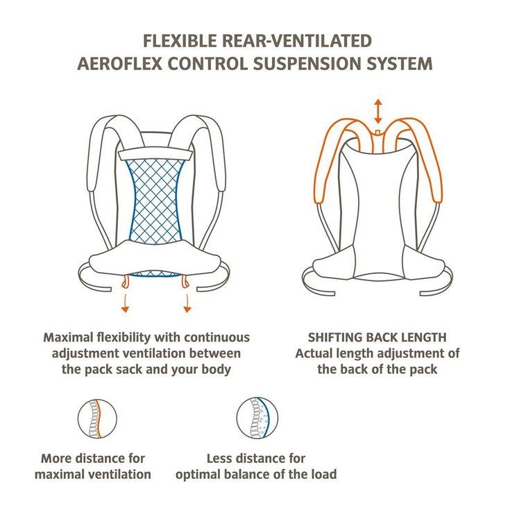 Система переноски Aeroflex Control обеспечивает хорошую вентиляцию спины и надежную фиксацию рюкзака.
