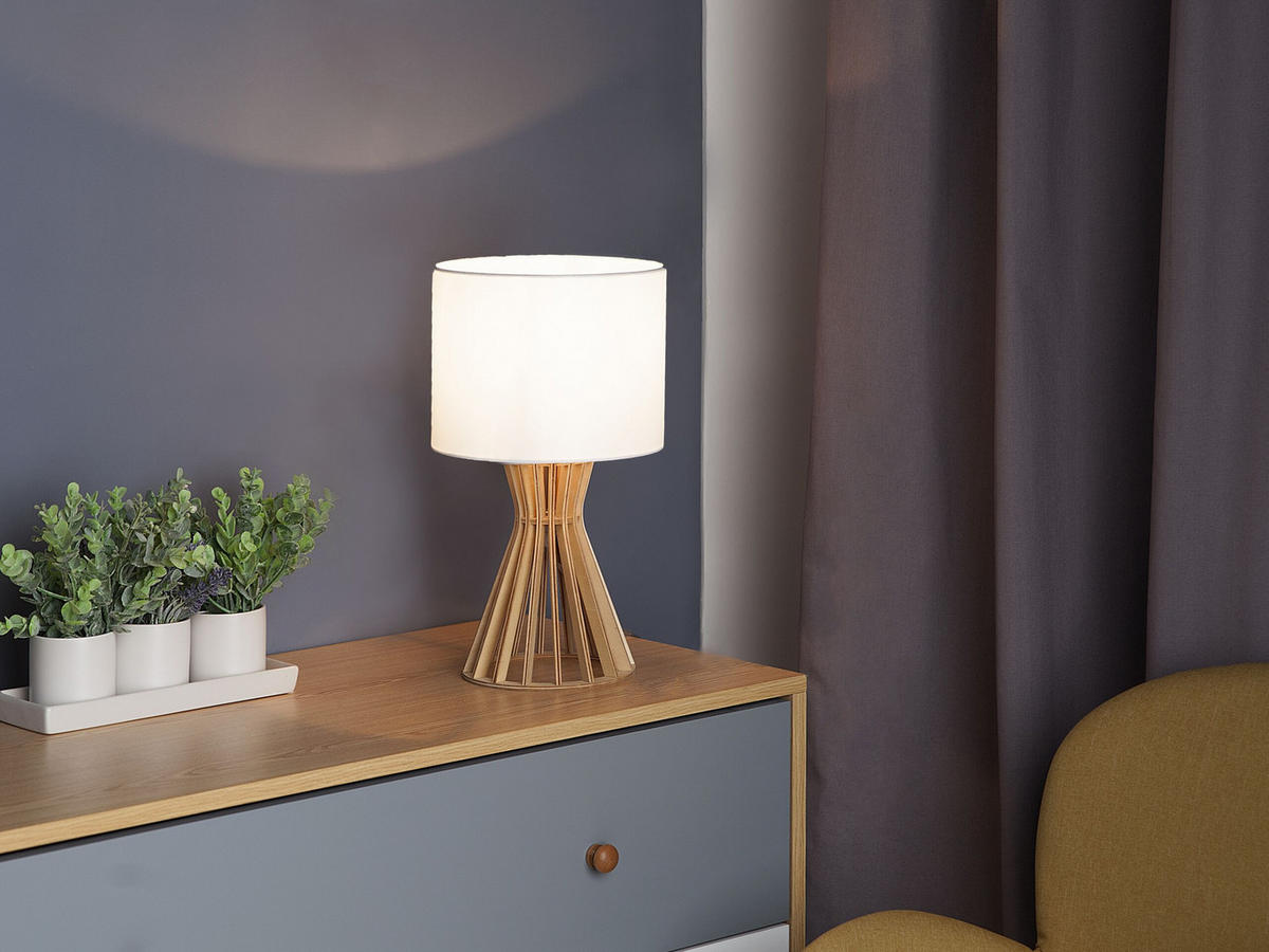 Изысканная настольная лампа в белом дизайне. Изящная форма основания лампы состоит из отдельных деревянных стержней с открытой структурой. Круглый абажур из белого поликоттона подчеркивает классический, уютный вид. Эта стильная и декоративная лампа произведет великолепное впечатление на больших приставных столиках или на комоде как вневременной аксессуар и как красивый источник света, обогащая любой интерьер классическим, элегантным штрихом. Лампа оснащена прозрачным кабелем с выключателем.
