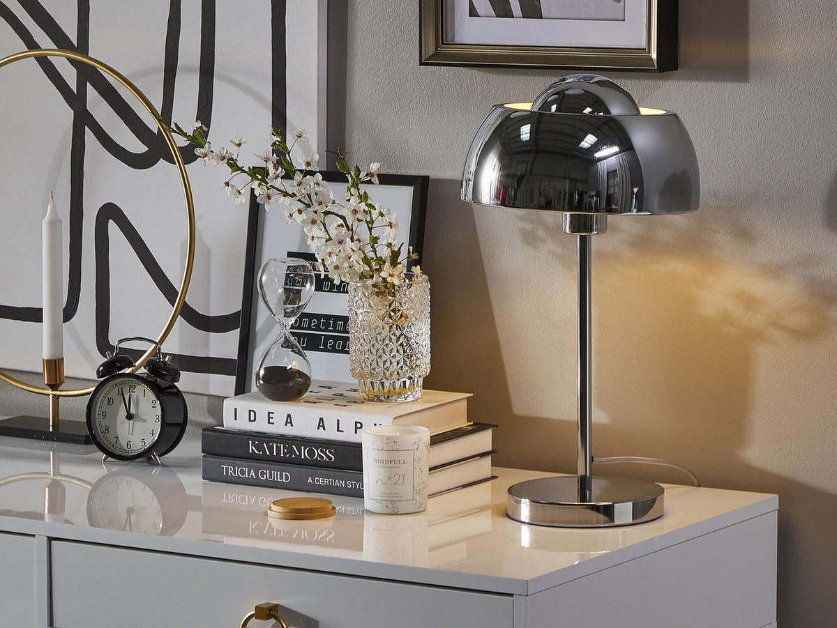 Серебряная настольная лампа с изысканной элегантностью. Настольная лампа должна быть не только практичной и функциональной; ее шикарный и современный дизайн также может дополнить ваш интерьер. Серебристый материал подчеркивает современную форму элегантным блеском. Осветительный прибор для всей гостиной и рабочей зоны, который подходит как для элегантного, так и для классического и современного стилей жизни.