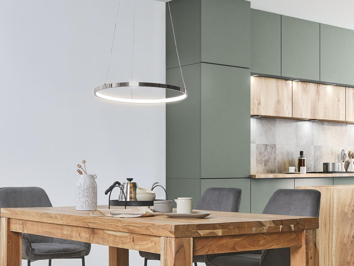 Круглый подвесной светильник со встроенной светодиодной подсветкой. Этот подвесной светильник идеально сочетает в себе простоту минимализма и роскошную элегантность гламура. Изготовленный из легкого алюминия, он имеет глянцевую поверхность, которая прекрасно вписывается в современный интерьер. Светильник имеет кольцевую форму и оснащен светодиодной подсветкой, поэтому вам не придется беспокоиться о лампочках. Элемент поставляется с прозрачным кабелем и декоративным колпачком для элегантного вида.