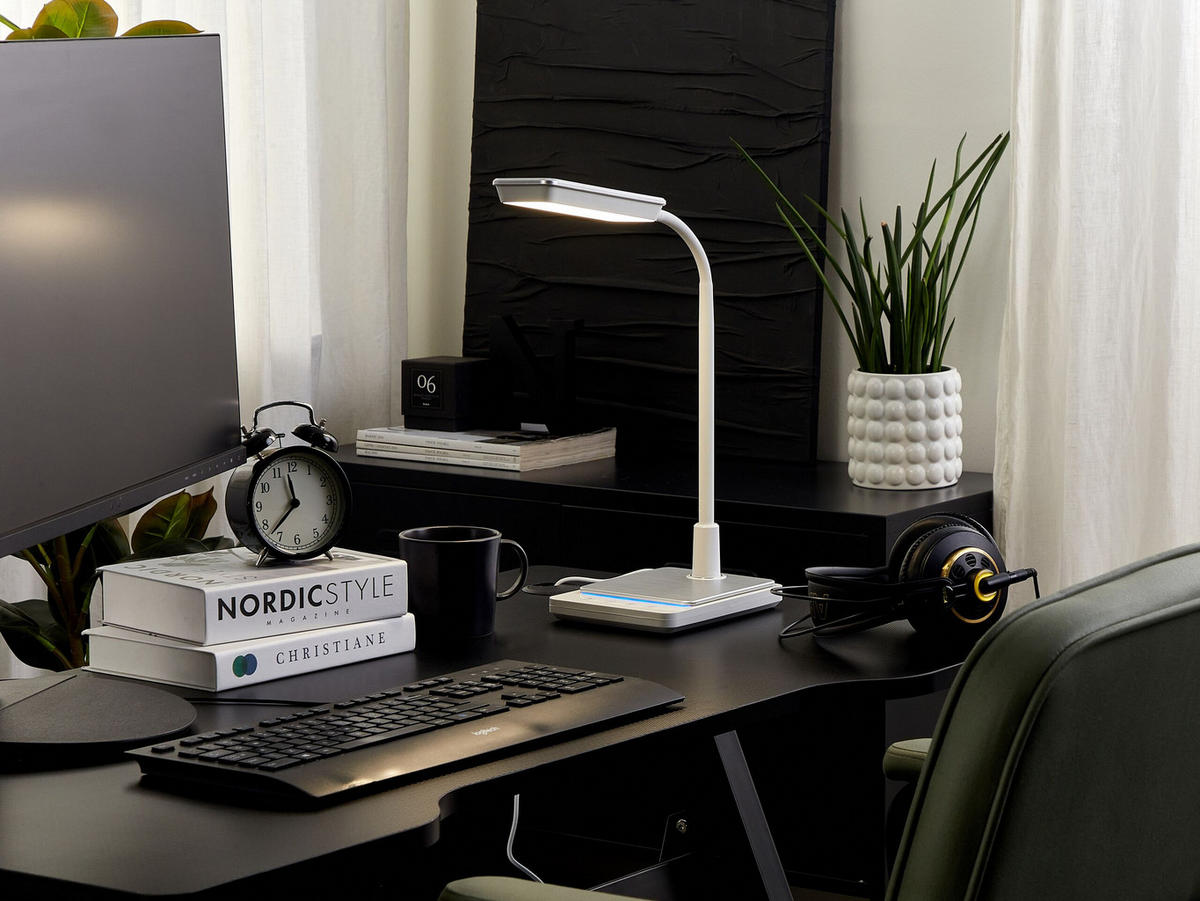 Светодиодный настольный светильник с регулируемой яркостью и регулируемым штативом. Добавьте функциональности своему рабочему пространству с этим современным офисным светильником. Он отличается простым силуэтом, но оснащен полезными функциями, такими как плавная регулировка яркости и выбор цветовой температуры. Управление этими функциями осуществляется кнопкой на основании. Синий индикатор также сигнализирует о включении светильника. Благодаря гибкому рычагу вы можете точно направить свет в нужное место.